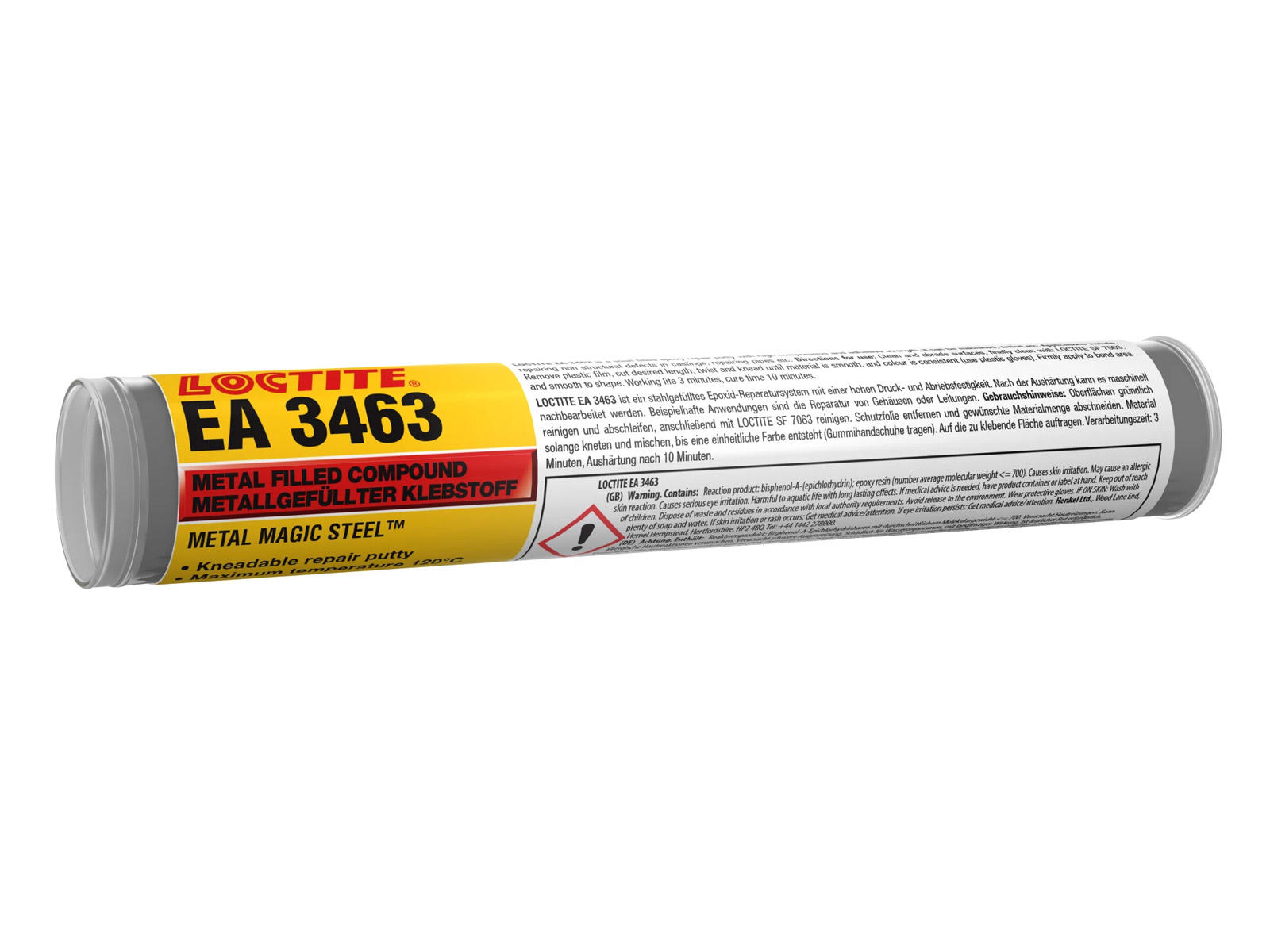 LOCTITE Metalmasse 3463 er en to-komponent epoxybaseret reparationsmasse med stålfyldning, lavet til struktursammenføjning og nødreparationer. Produktet, kendt som Magic Metal Steel Stick, er en alsidig løsning, der passer til mange materialer. Efter hærdning tilbyder det stærk trykstyrke og god vedhæftningsevne, hvilket gør det ideelt til tætning af lækager i rør, udjævning af svejsesømme og restaurering af skader i ikke-bærende støbeemner.