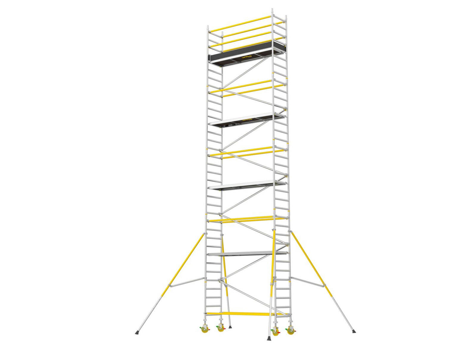 Rullestilladset, målende 0,75 x 2,5 m, præsenterer en optimal løsning for arbejde i højden, hvor pladsen er begrænset. Med et intelligent design, der inkluderer overlappende afstivning, sikrer dette rullestillads et sikkert arbejdsmiljø.