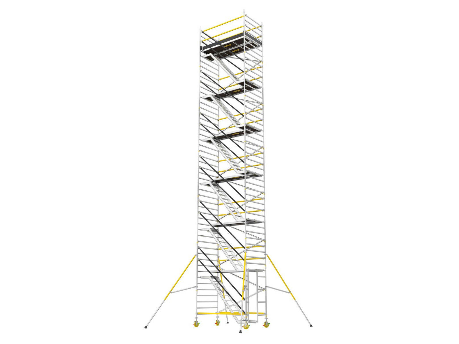 Dette trappestillads præsenterer sig som en stabil og pålidelig løsning, optimeret for sikkerheden ved arbejde i højder. Med dimensionerne 1,4 x 2,5 meter tilbyder det en alsidig anvendelse.