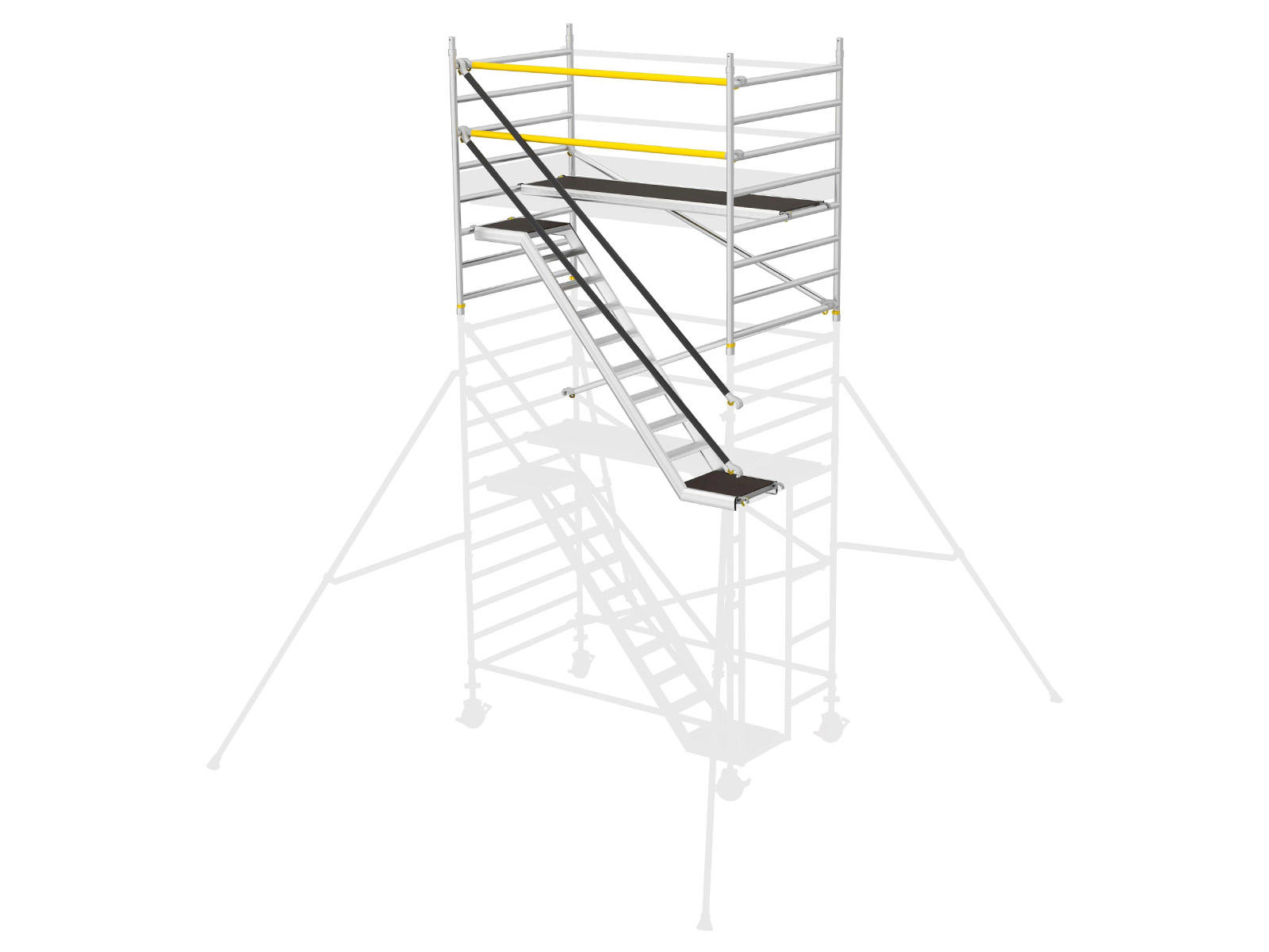 Yderst stabilt trappestillads med dimensionerne 1,4 x 2,5 meter. Dette avancerede stillads er udformet med overlappende afstivning, som yder et forstærket fundament, der er essentielt for et sikkert arbejdsmiljø i høje arbejdspositioner. Det er komplet med integrerede trapper, platforme anbragt hver anden meter, to øvre platforme, fodlistesæt, justerbare hjul på 200 mm og støtteben.