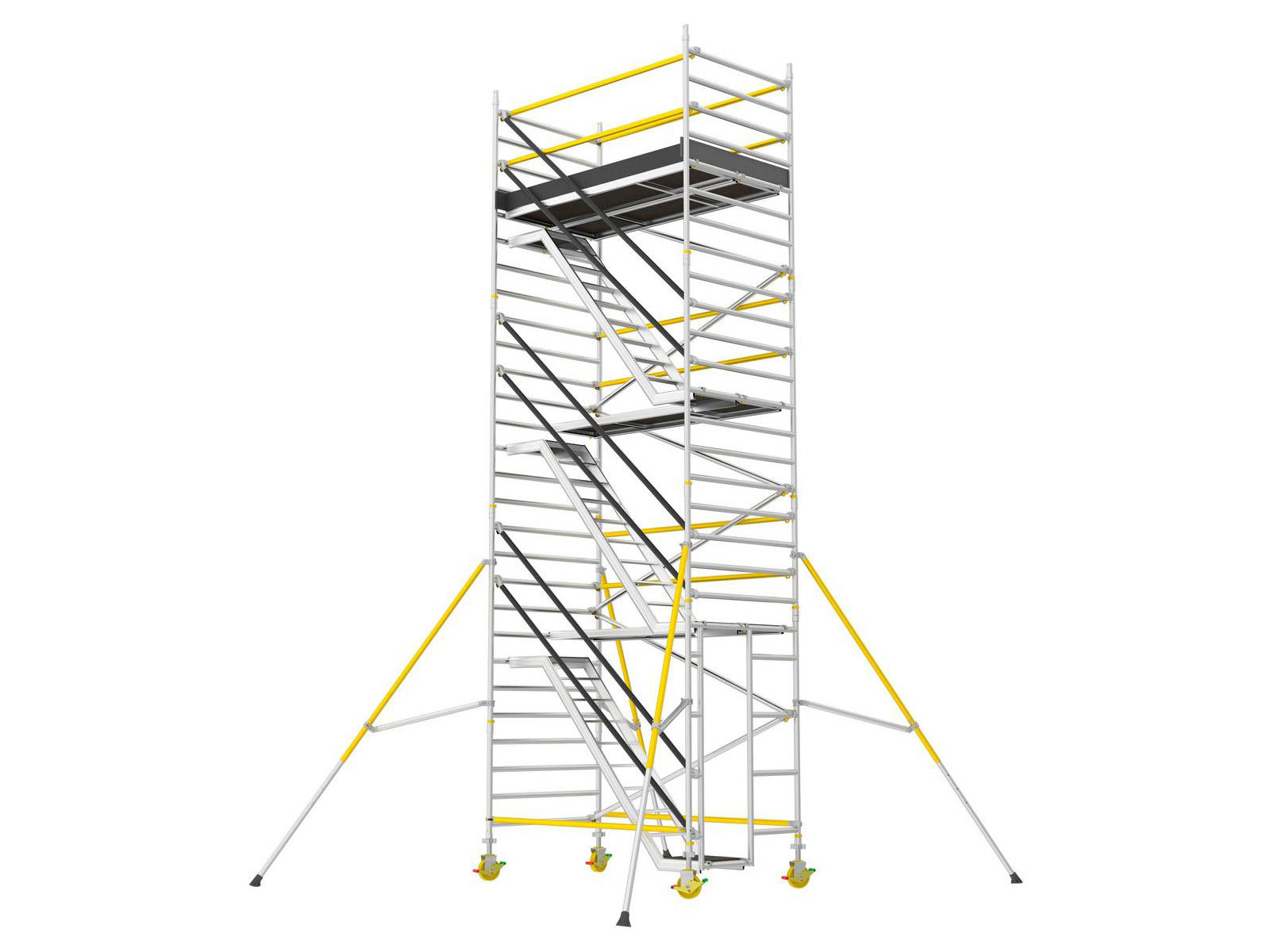Trappestillads, der er karakteriseret ved sin bemærkelsesværdige stabilitet, med målene 1,4 x 2,5 meter. Dette stillads er konstrueret med overlappende afstivning, som tilfører ekstra styrke, hvilket er afgørende for et sikkert arbejdsmiljø i store højder. Det er komplet med trapper, platforme placeret hver anden meter, to øvre platforme, fodlistesæt, justerbare hjul på 200 mm og støtteben.