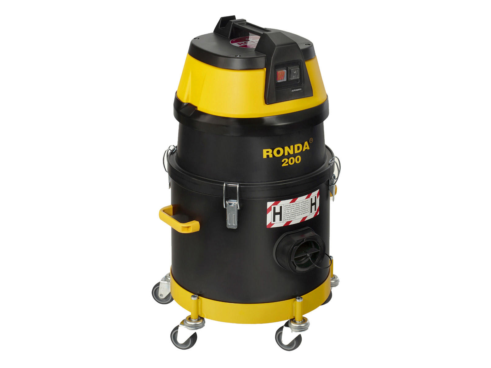 RONDA 200H-S Green Tech er en komplet maskine med en separat udblæsningsstuds og et effektivt filtersystem bestående af et kanalfilter og et HEPA filter. Du kan vælge mellem at opsamle støvet i en syntetisk pose eller direkte i beholderen. Støvsugeren har en enkel filterrensning under drift, vedvarende sugestyrke, lavt støjniveau og et el-udtag med start/stop automatik. Derudover kan den leveres med separat luftafgang, soft start af motor og bipperalarm ved for lav luftgennemstrømning.