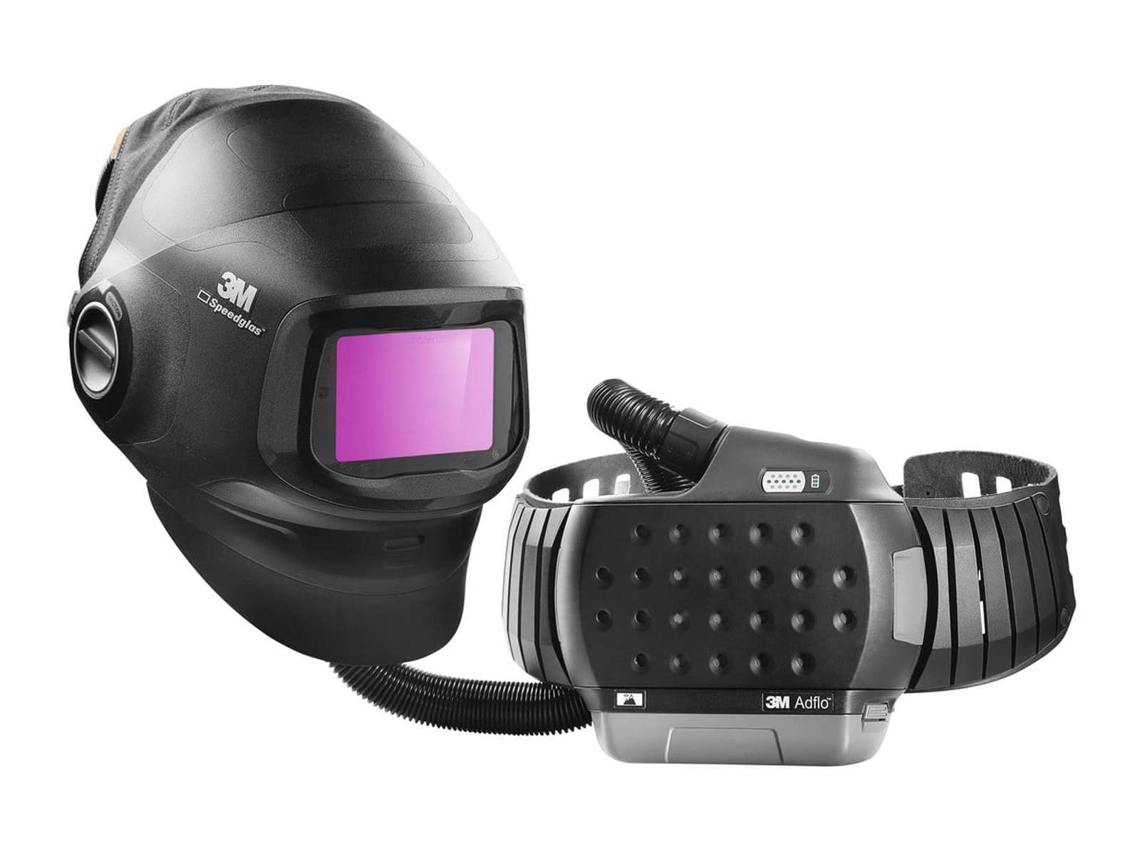 G5-01 system til tung svejsning: 3M Speedglas G5-01 svejsehjelm med automørknende kassette G5-01VC og 3M Adflo turboåndedrætsværn. Stor buet klarvisir giver bredt udsyn ved slibning og opsætning, og luftkanaler lader brugeren styre luftstrømmen i hjelmen. Se svejsehjelme med friskluft for flere løsninger.