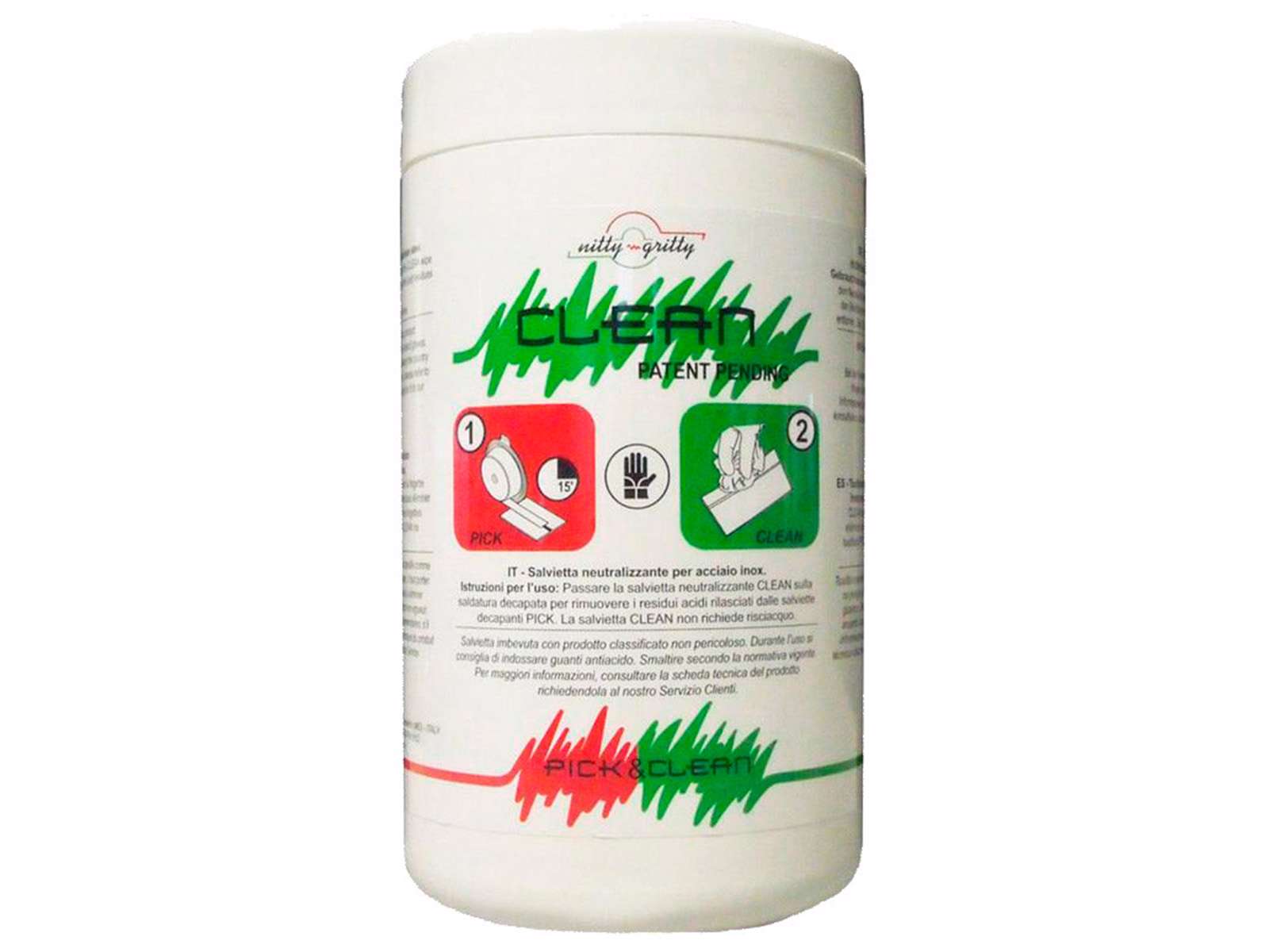 NITTY GRITTY CLEAN WIPE er et renseprodukt, specialdesignet til at neutralisere syrerester efter bejdsningsprocessen med PICK PLUS bejdsetape. Dette højteknologiske redskab sikrer en omhyggelig og fuldstændig rensning, hvilket gør efterbehandlingen af svejsninger til en ubesværet opgave. Med sin præcise formulerede teknologi, tilbyder NITTY GRITTY CLEAN WIPE en høj grad af effektivitet, som fremmer en problemfri efterbehandling og sikrer, at svejsningerne forbliver rene og syrefrie.