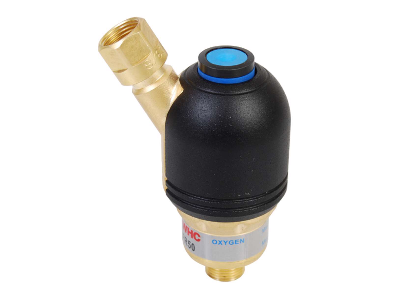 FR50 for Oxygen viser en blå farvemarkering, når den er åben og i funktion. Ved et tilbageslag forsvinder den blå markering.