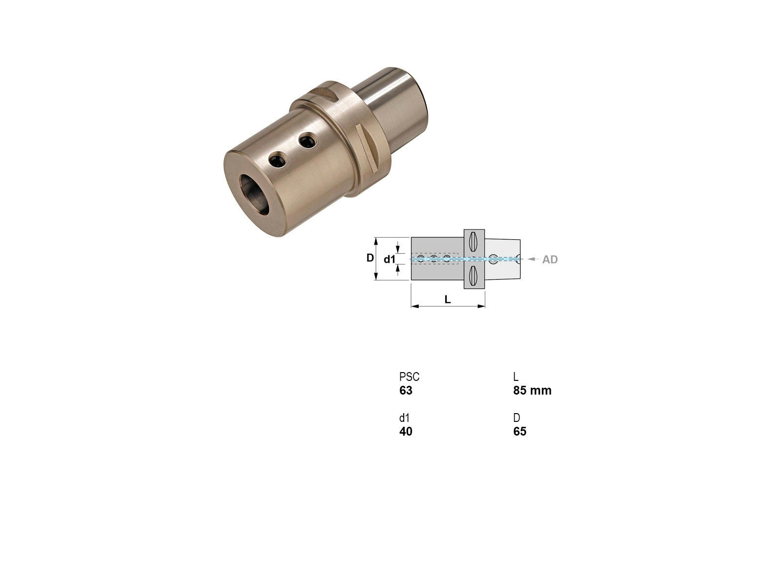 Canela Holder til Borestænger er en robust værktøjsholder med en længde på 85 mm, der omdanner PSC 63 konus til Ø40. Den er designet i overensstemmelse med ISO 26623-1 standarden, som sikrer høj præcision og pålidelighed i brug. Udstyret med kølesystem, der effektivt leder varme væk under drift, forlænger dette værktøjets levetid og forbedrer bearbejdningskvaliteten.