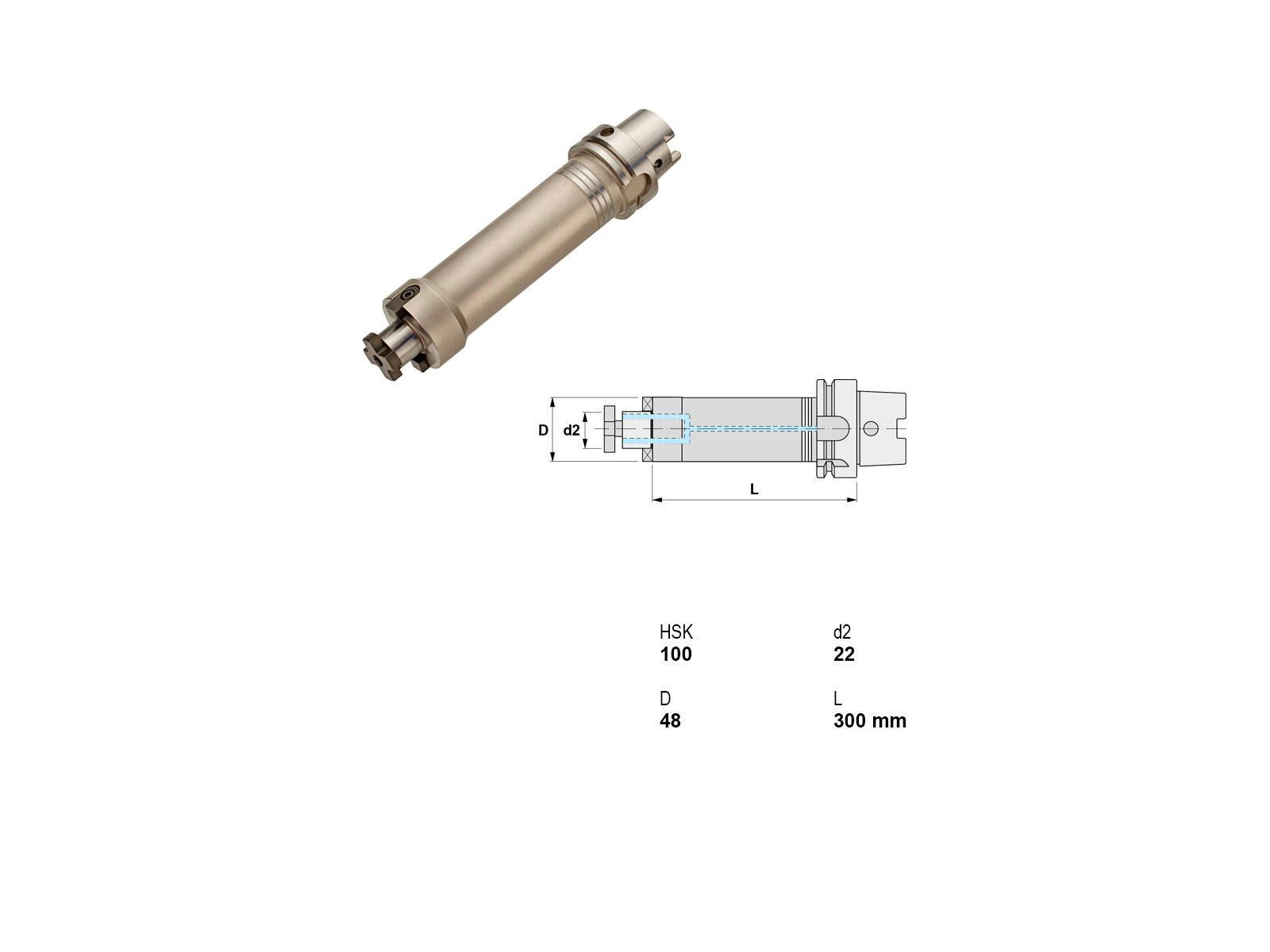 Canela fræsedorn med avanceret vibrationsdæmpning til præcis bearbejdning. Denne robuste dorn er 300 mm lang og har en diameter på 48 mm, hvilket sikrer solid stabilitet og præcision under operationer. Ø22 mm værktøjsfæste (DIN 138) og HSK 100 Form A konus (DIN 69893-1) garanterer kompatibilitet med en bred vifte af maskiner. Udstyret med integreret kølesystem for optimal ydeevne.