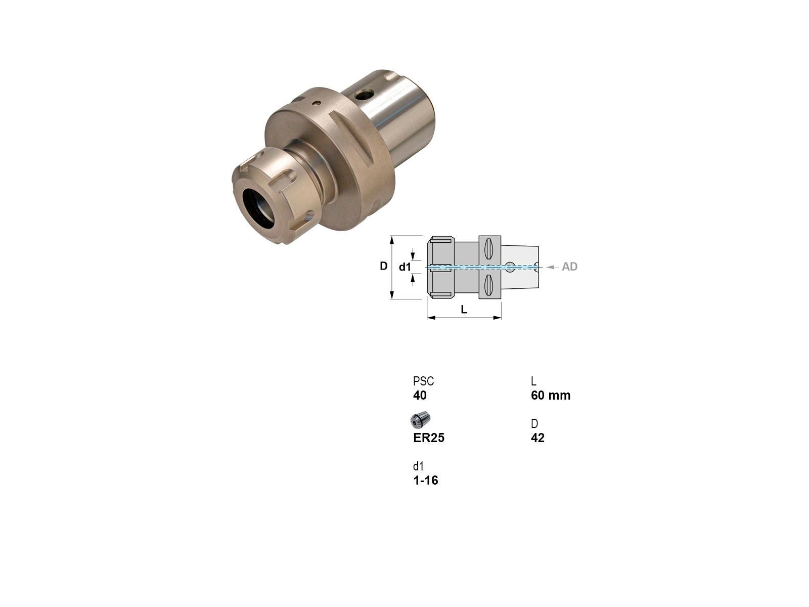Canela værktøjsholder er designet til præcisionsarbejde med en længde på 60 mm og en klemmekapacitet på 1-16 mm. Denne holder er kompatibel med PSC 40 (ISO 26623-1) værktøjsfæstesystemet og har en ER25 optag (DIN 6499), som sikrer robust og stabil værktøjsmontage. Den integrerede kølingsfunktion optimerer bearbejdningsprocessen ved at afkøle værktøjsspidsen effektivt under brug.