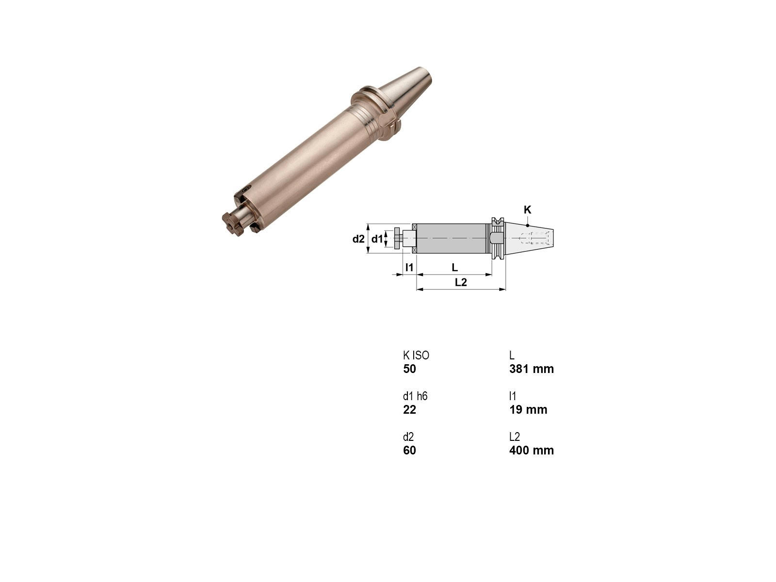 Canela fræsedorn med vibrationsdæmpning er et essentielt værktøj for professionelle. Denne model er 400 mm lang og har en diameter på 60 mm, designet til at understøtte Ø22x19 mm værktøjsfæste (DIN 138) og er udstyret med en robust ISO 50 konus (DIN 69871-A). Ideel til brug hvor præcision er nødvendig, da den reducerer vibrationer markant, selv uden køling.