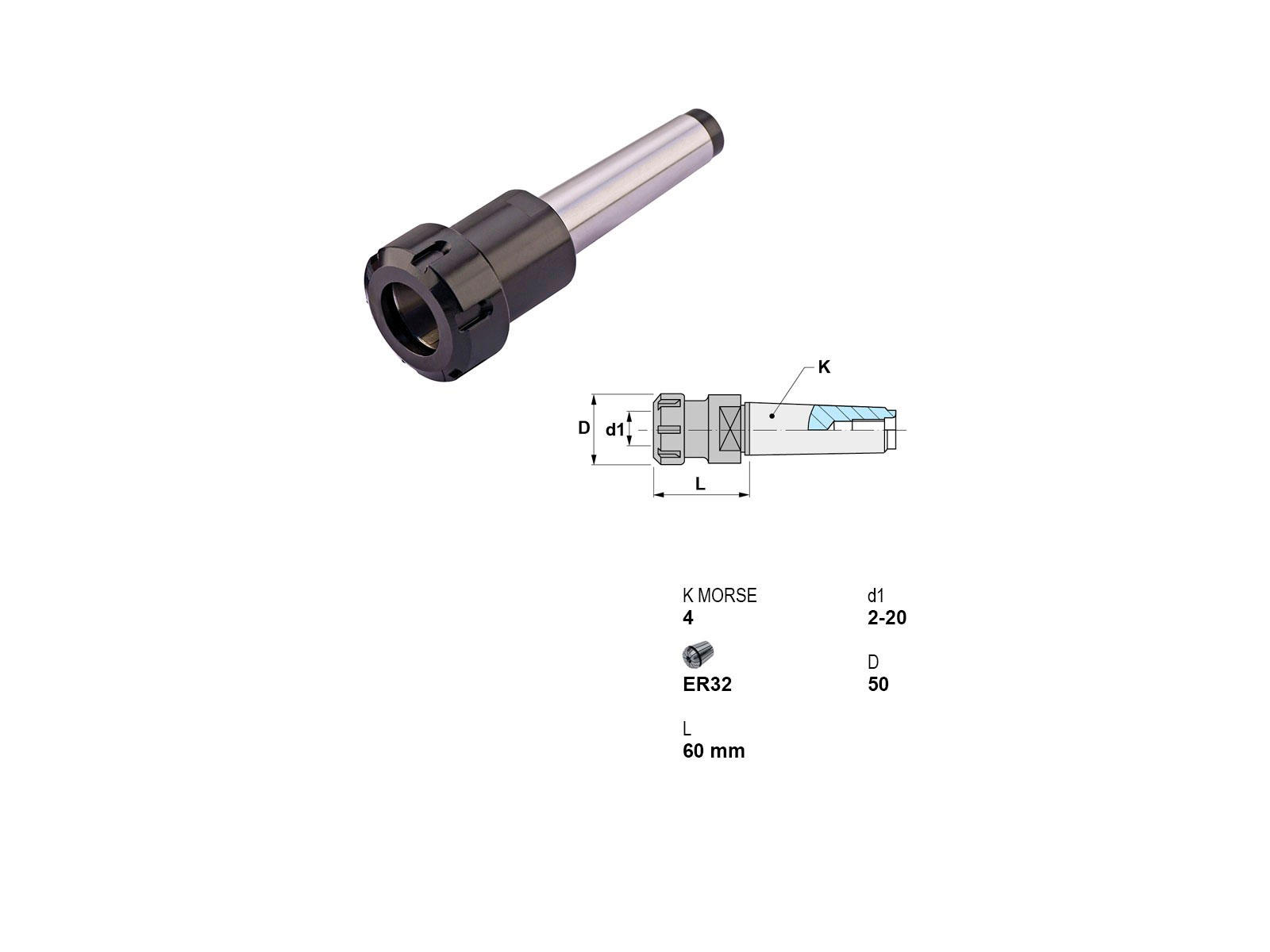 • Canela værktøjsholder er ideel for præcisionsopgaver. Med en længde på 60 mm og en diameter på 50 mm, er denne model fra MK4-serien designet til ER32 klemmer. Den har en spændvidde på 2-20 mm, som sikrer en bred anvendelighed. Værktøjsholderen kommer uden kølingsfunktion, hvilket gør den velegnet til operationer, hvor køling ikke er nødvendig.