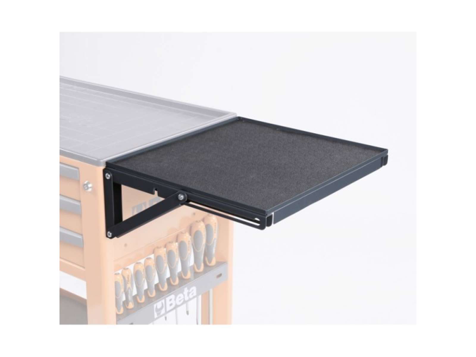 Beta Tools 2400 RSC24/MP er en foldbart sideboard designet specifikt til brug med Beta Tools' mobile rullekabinetter, herunder modellerne RSC24, RSC24A og RSC51. Denne hylde tilføjer væsentlig funktionalitet til rullekabinetterne ved at udvide den tilgængelige arbejdsflade, hvilket gør den ideel til mekanikere og teknikere, der ofte har brug for ekstra plads til værktøjer og arbejdsopgaver.