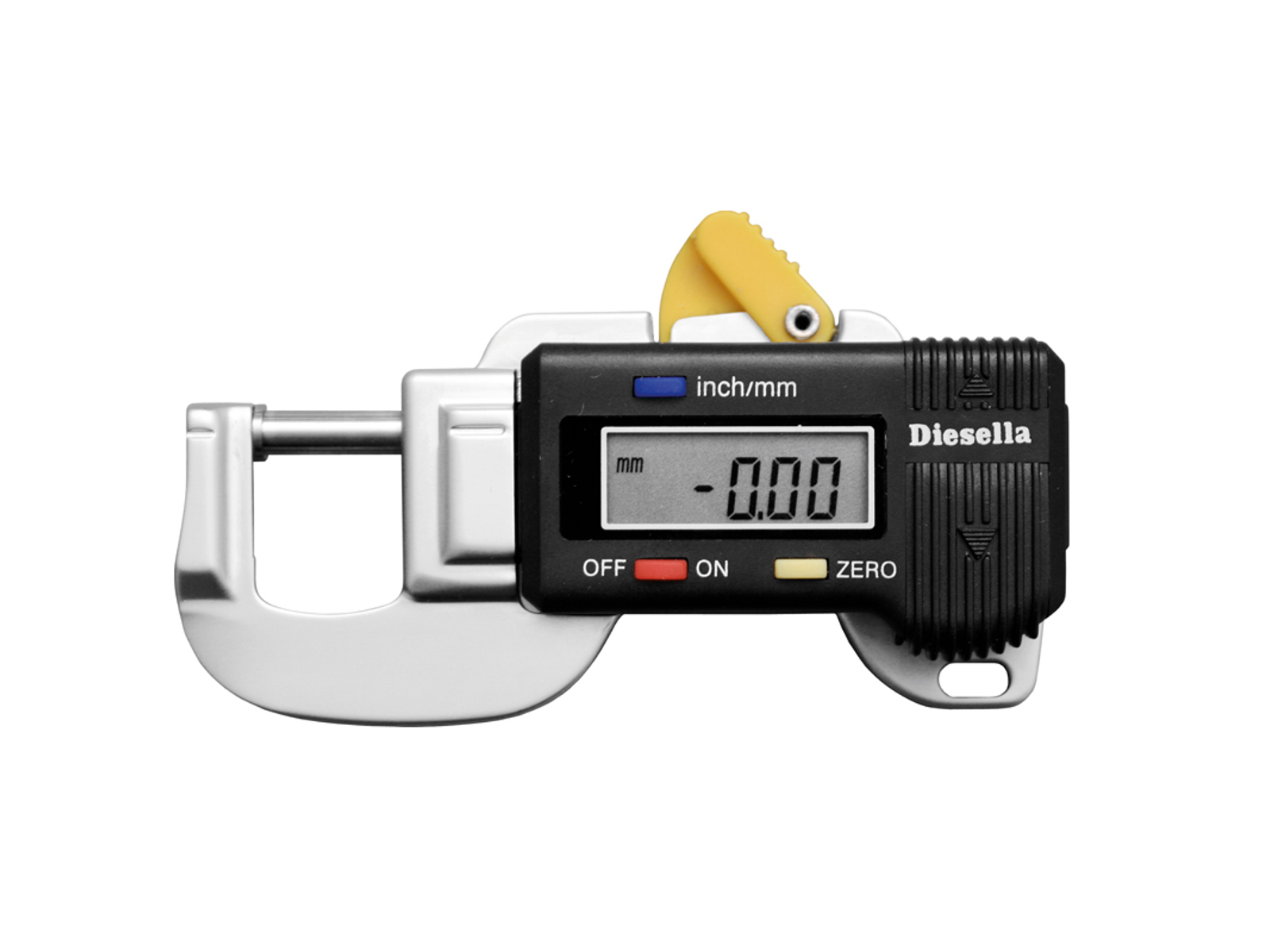 Præsentation af en digital tykkelsesmåler, der kombinerer teknisk præcision med brugervenlighed. Denne model er konstrueret til at levere nøjagtige målinger på en række materialer, herunder papir, stof og pap, og har et ensartet måletryk. Den bekvemme omskifter tillader skift mellem millimeter og tommer, og dens nulstillingsfunktion sikrer konsistente og korrekte aflæsninger ved hver brug.