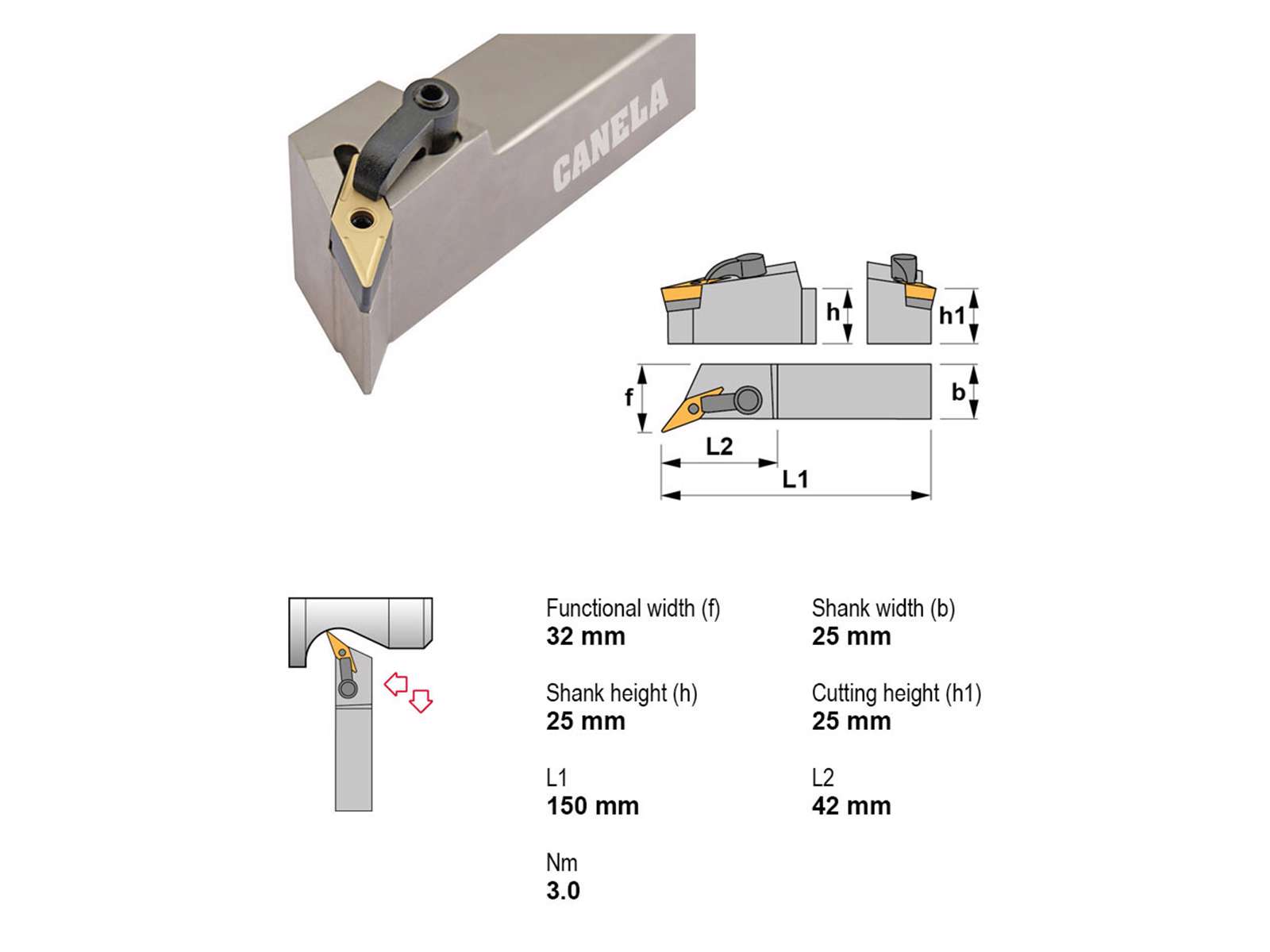 Canela MVQNR2525M16-K stålholder er en robust og præcis løsning til krævende drejeopgaver. Den kompakte konstruktion sikrer optimal ydeevne, mens kompatibilitet med VNGP1604-platter giver fleksibilitet og præcision.