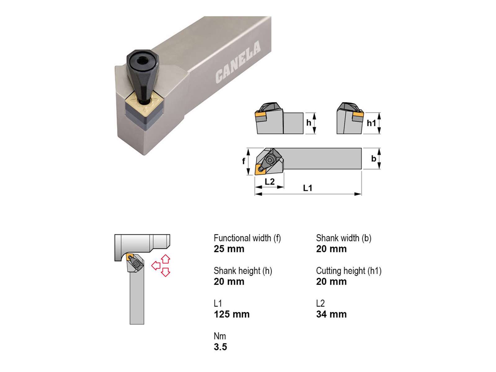 • Canela stålholder DCLNR2020K12-N er en robust og præcis holder. Denne holder sikrer høj stabilitet og præcision, ideel til bearbejdning med CN..1204.. platte. Med sit kompakte design uden køling er den et pålideligt valg til krævende opgaver.