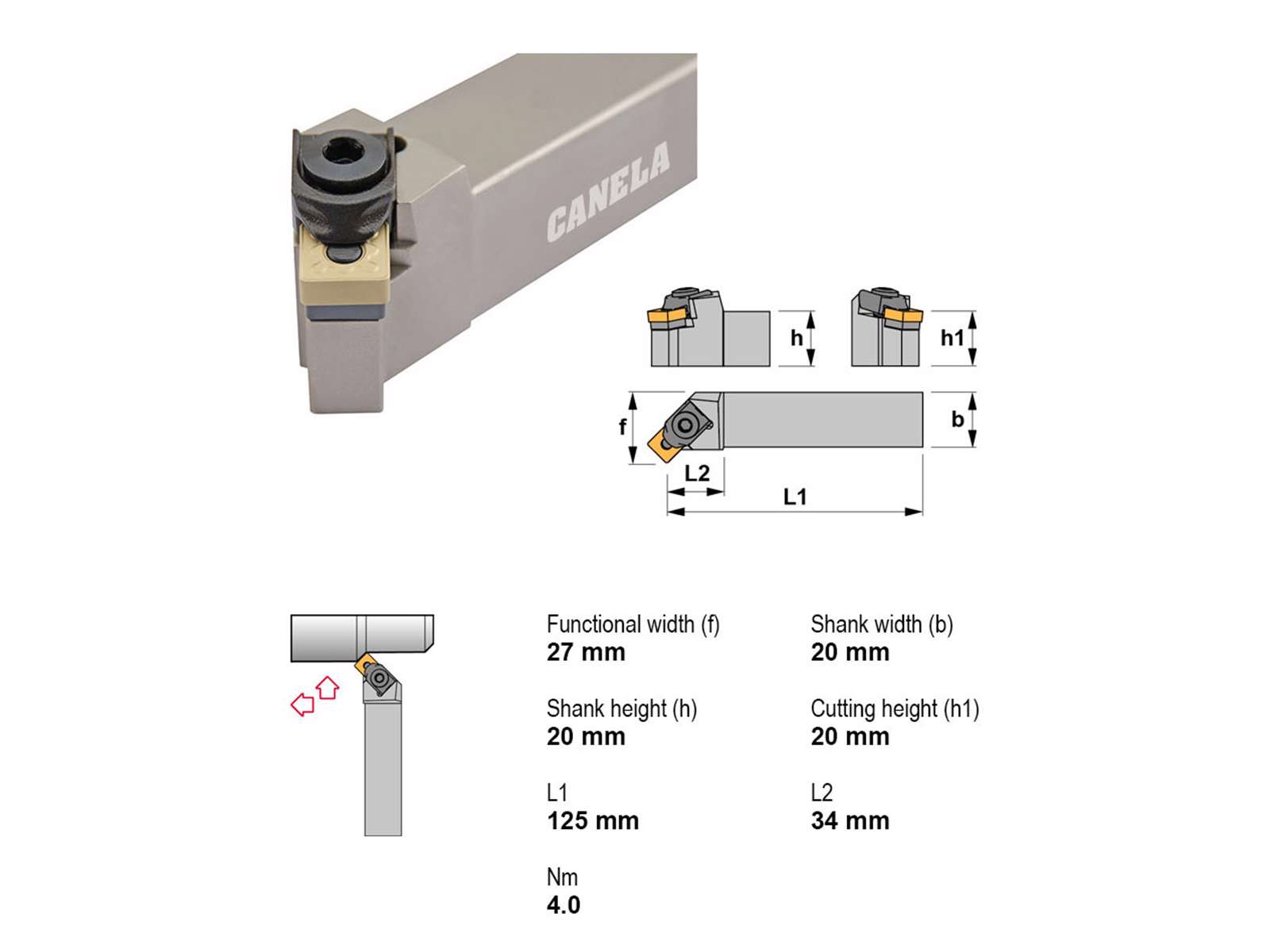 Canela MSSNR2020K12 stålholder sikrer præcision og holdbarhed til dine drejeopgaver. Denne højrehåndsmodel er designet til SNM..1204..-platter og er ideel til krævende skæreapplikationer uden køling.