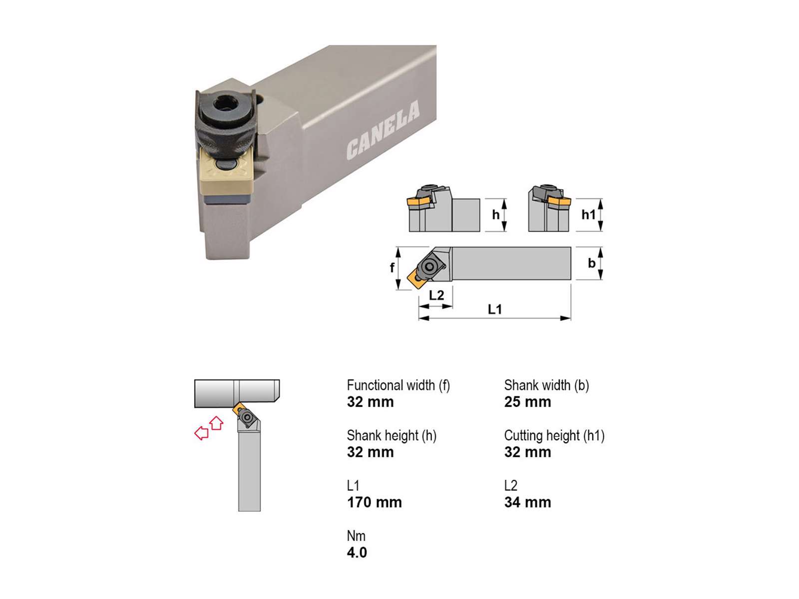 • Canela stålholder MSSNR3225P12 er en robust og præcisionsfremstillet holder designet til højrehåndsskæringer. Med sin solide konstruktion sikrer den stabilitet og præcision, selv under krævende bearbejdningsopgaver. Perfekt til SNM..1204..-platter og uden kølefunktion.