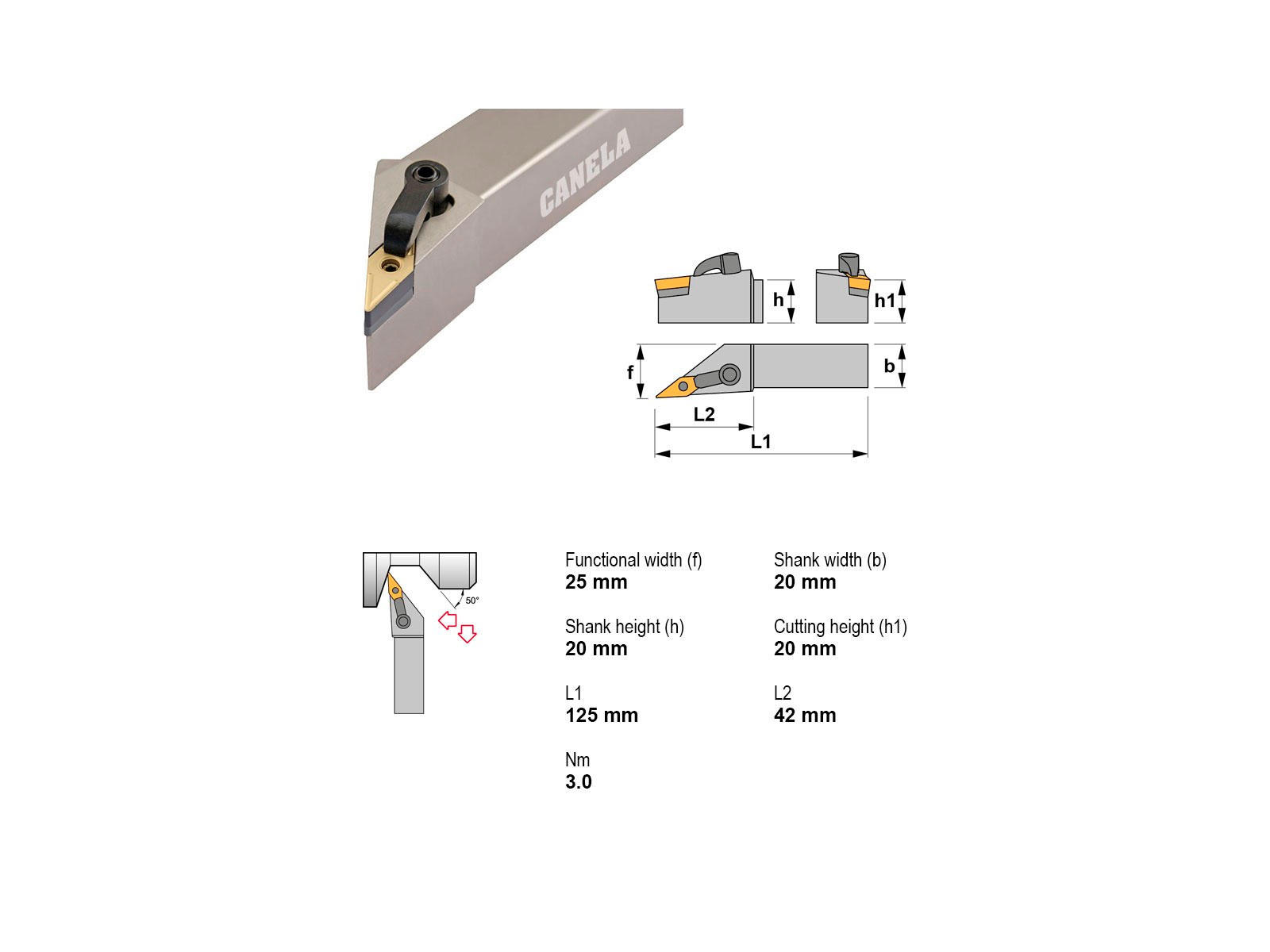 Canela MVJNR2020K16-K er en robust og præcis stålholder designet til højreindgreb med VNMG1604.. platte. Med en kompakt størrelse og høj skærehøjde sikrer den effektiv bearbejdning og holdbarhed i produktion.