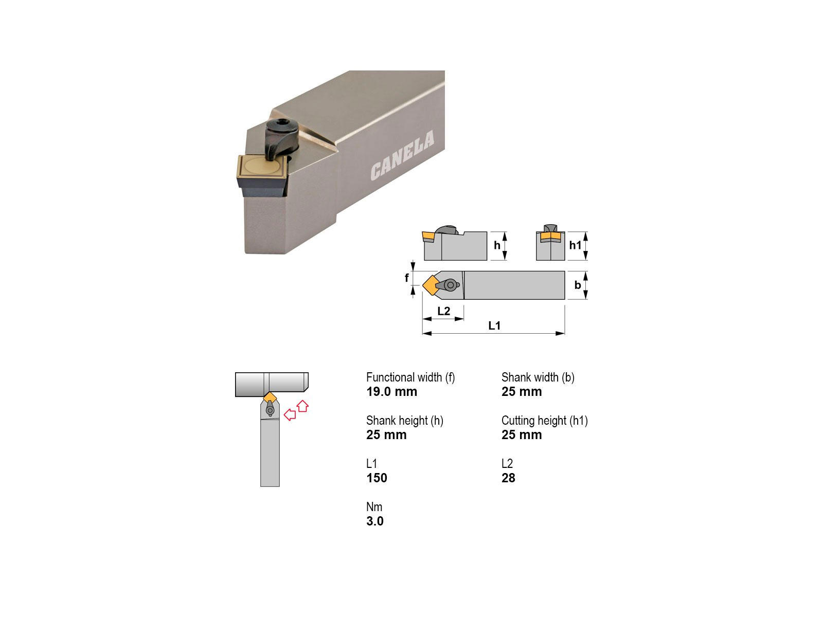 Canela stålholder CSDPR2525M12 er et robust værktøj ideelt til præcisionsbearbejdning. Med en længde på 150 mm og en solid skaftdimension på 25x25 mm er den velegnet til krævende opgaver, hvor stabilitet og holdbarhed er essentielt. Designet uden køling og til højrehåndsindgreb gør denne holder ideel til tørbearbejdning.