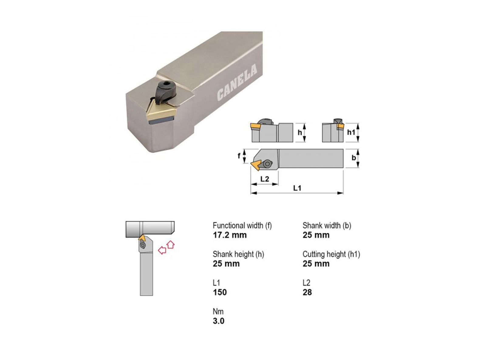 • Canela stålholder CTDPR2525M16 er en pålidelig og præcisionsfremstillet drejeholder designet til professionel bearbejdning. Med en robust 25x25 mm skaft og en længde på 150 mm sikrer denne holder stabilitet og præcision i højre indgreb. Ideel til TP..1603.. platte, og med hovedmål på 28x25 mm passer den til krævende opgaver uden køling.