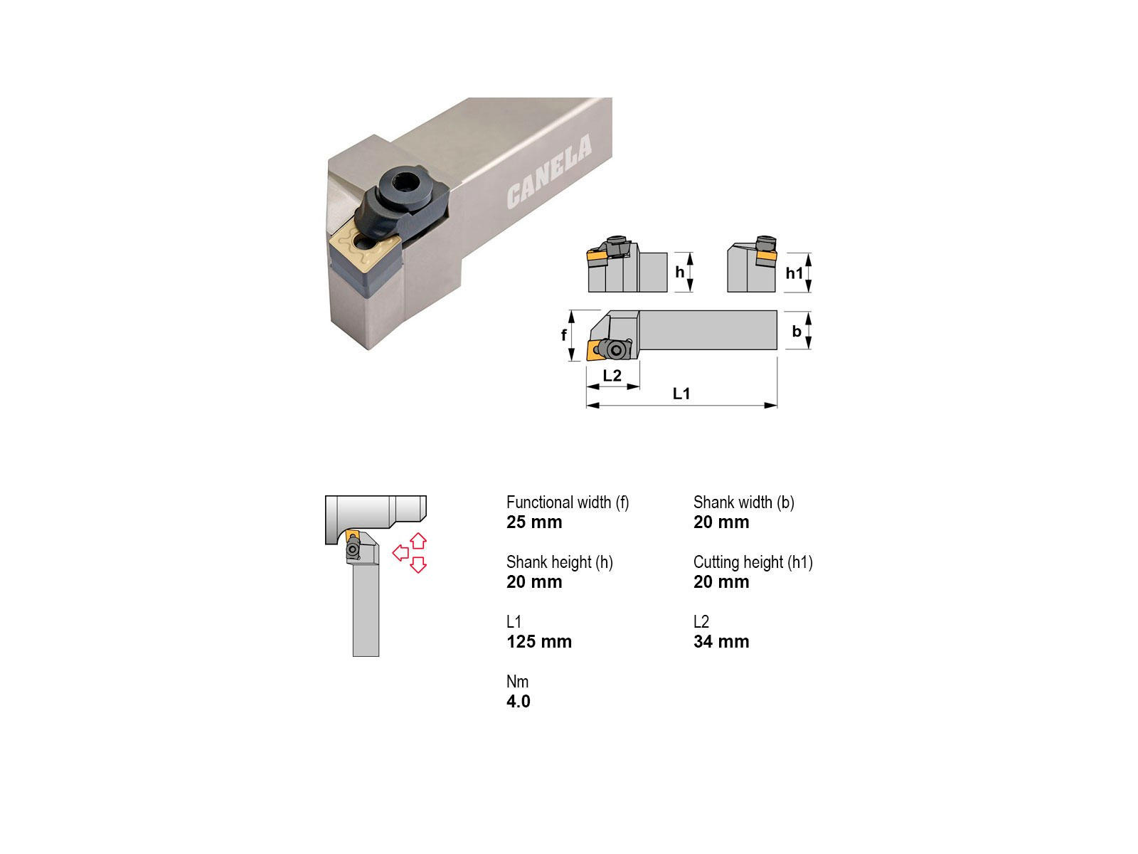 Canela MCLNR2020K12 er en præcis og robust stålholder, designet til professionelle bearbejdningsopgaver. Den kompakte konstruktion sikrer stabilitet og præcision under brug. Passer til CN..1204.. platte og er ideel til højrehåndet indgreb. Perfekt til skærende bearbejdning uden køling.