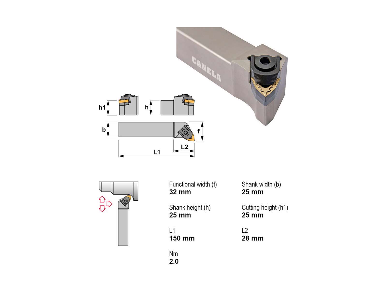• Canela stålholder MWLNL2525M06 er en robust og alsidig holder designet til præcisionsbearbejdning med WNMG0604.. platte. Den solide 25x25 mm skaft sikrer stabilitet under krævende bearbejdning. Ideel til drejning uden køling.