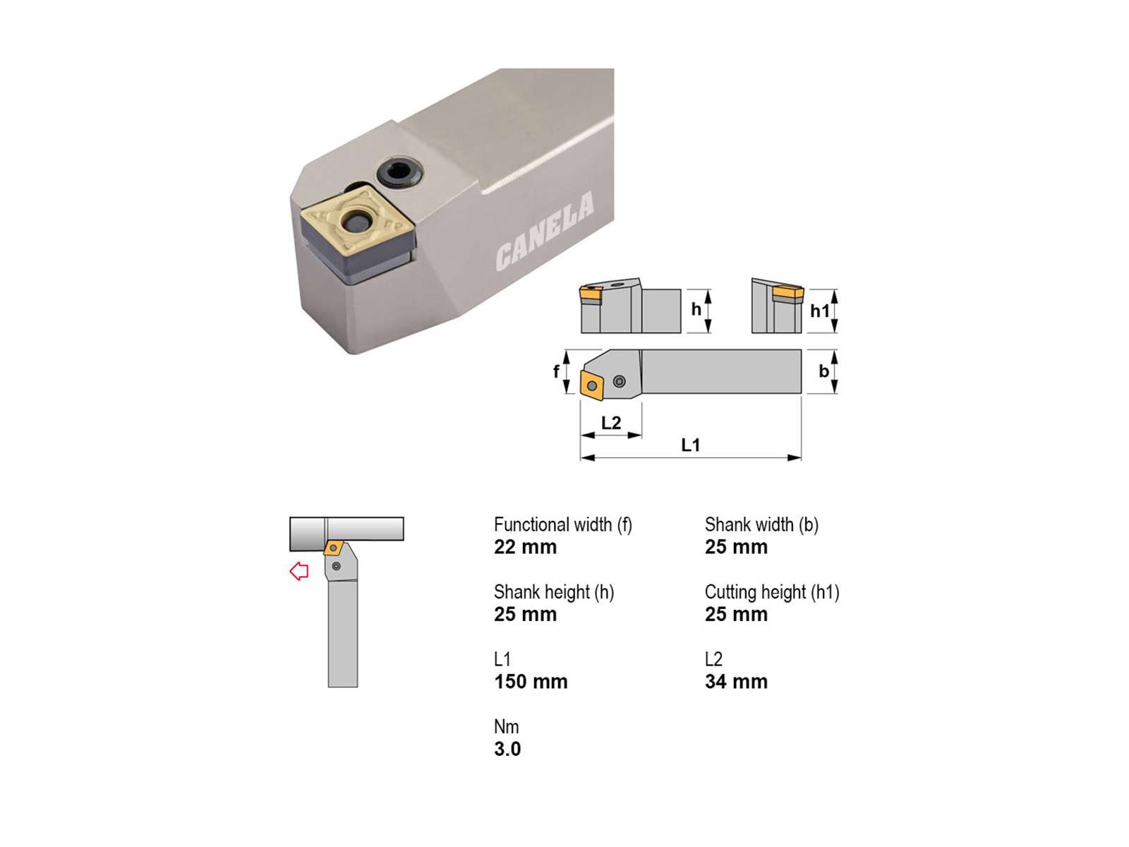 Canela PCBNR2525M16 stålholder er et robust og præcist værktøj designet til professionelle bearbejdningsopgaver. Med en længde på 150 mm og en skærehøjde på 25 mm sikrer den høj stabilitet og nøjagtighed. Ideel til venstrehåndsindgreb og kompatibel med CN..1606.. platte.