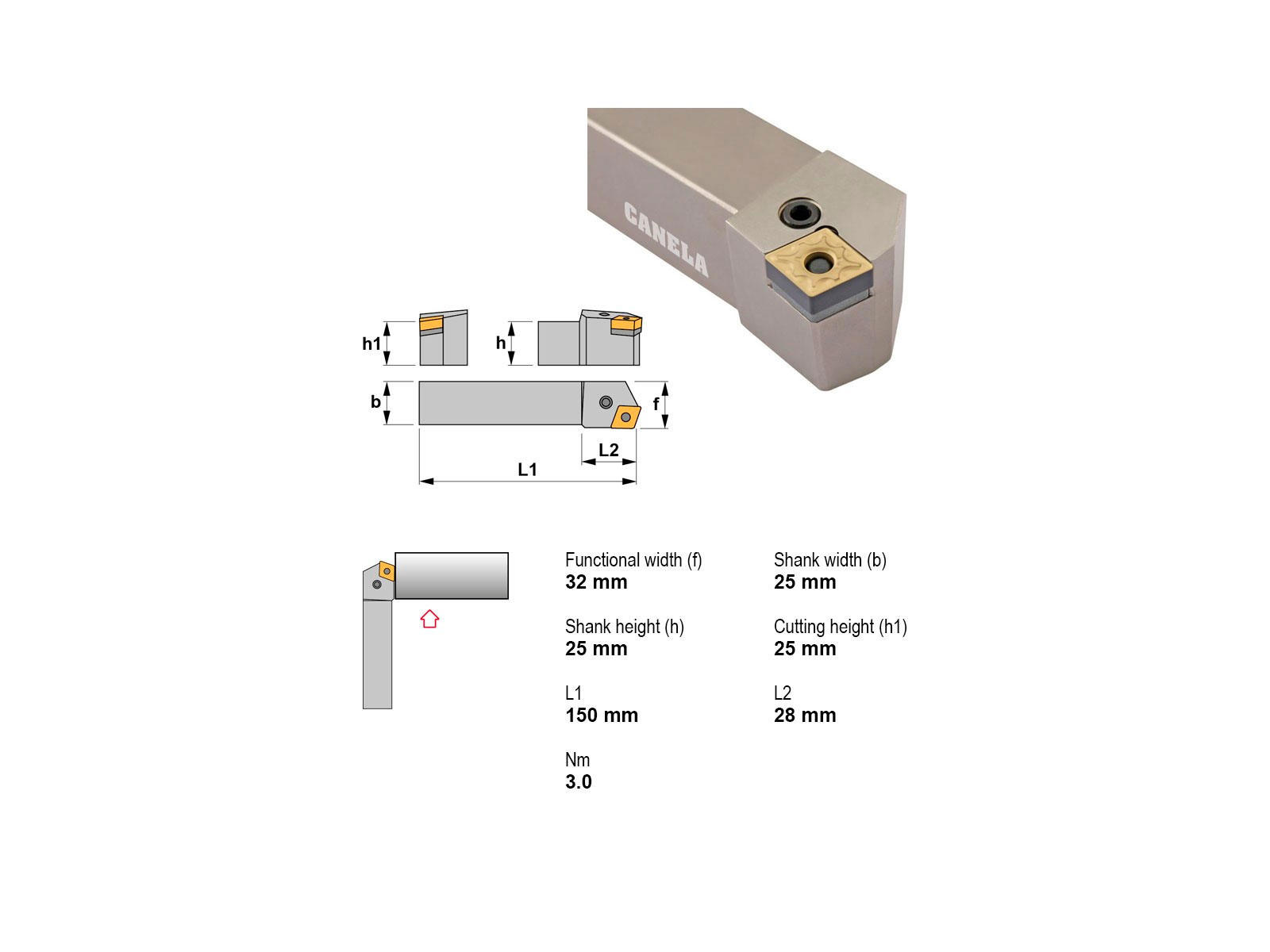 Canela PCKNL2525M12 stålholder er et robust og præcist værktøj designet til professionelle bearbejdningsopgaver. Med en længde på 150 mm og en skærehøjde på 25 mm sikrer den høj stabilitet og nøjagtighed. Ideel til venstrehåndsindgreb og kompatibel med CN..1606.. platte.