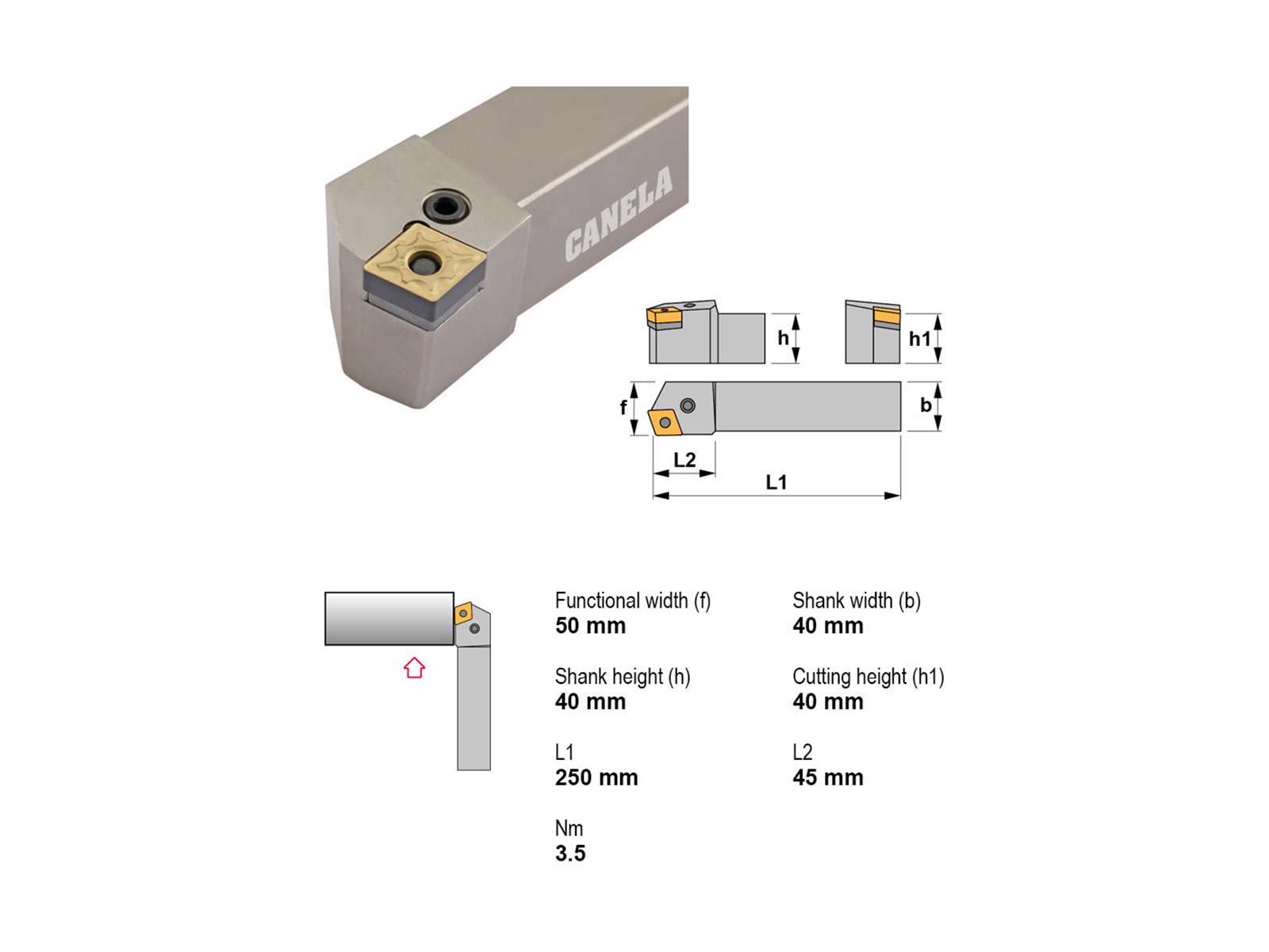 • Canela stålholder PCKNR4040S19 er en robust og præcis holder designet til højreindgreb. Med en solid 40x40 mm skaftstørrelse og kompatibilitet med CN..1906.. platte sikrer den stabilitet og optimal ydeevne. Ideel til industriel brug uden køling.