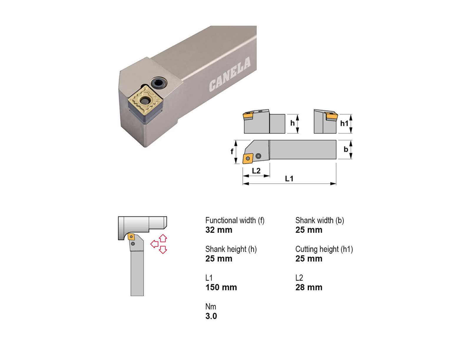 • Canela PCLNR2525M12 stålholder er en robust og præcisionsfremstillet holder designet til professionelle bearbejdningsopgaver. Med høj kvalitet og kompatibilitet med CN..1204.. platte sikres præcise og effektive skæreresultater.