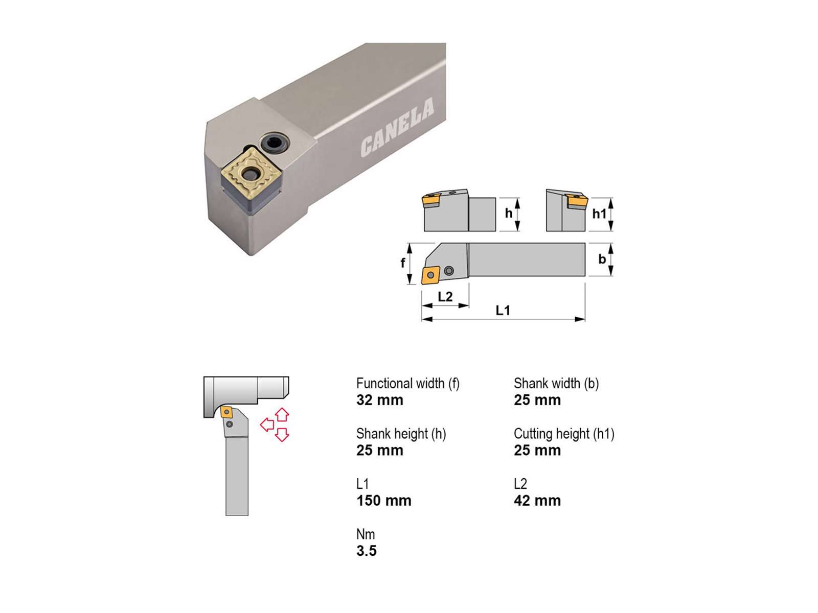 Canela stålholder PCLNR2525M19 er en robust og præcisionsdesignet holder til bearbejdningsopgaver. Den er ideel til højreindgreb og kompatibel med CN..1906.. platte. Perfekt til professionelle løsninger uden køling.