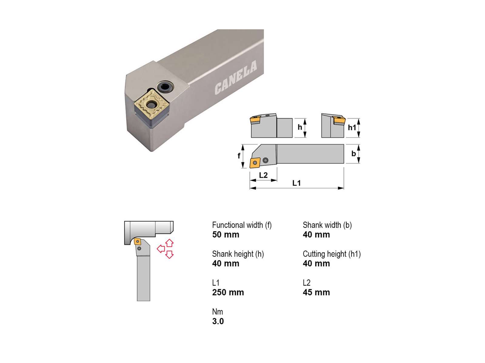 Canela PCLNR4040S16 stålholder er en robust og præcis holder til drejebænke, designet til krævende bearbejdning. Med et solidt skaft og understøttelse af CN..1606..-platter sikrer den optimal ydeevne og pålidelighed.