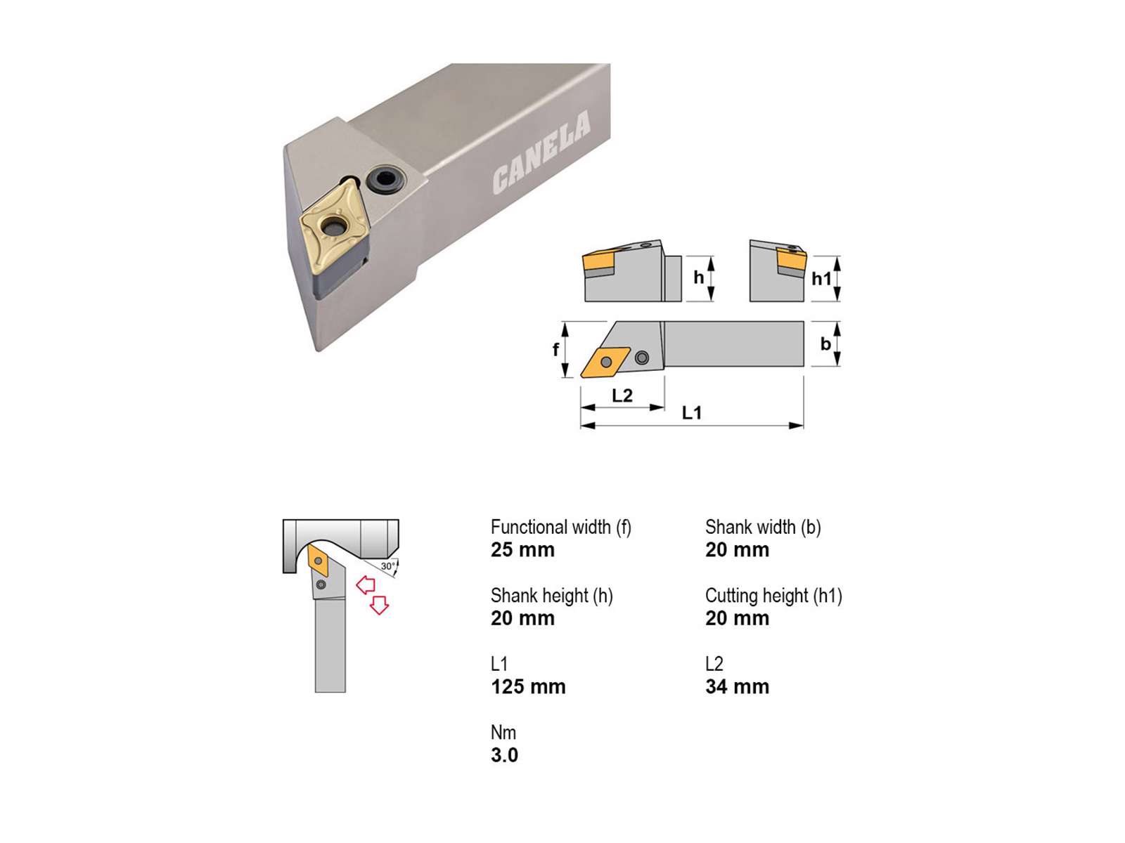 Canela stålholder PDJNR2020K15 er en robust og præcis holder designet til effektiv drejning. Med en længde på 125 mm og et kompakt skaft på 20x20 mm, sikrer den stabilitet og høj ydeevne. Den er kompatibel med platte DN..1506.. og er udviklet til højrehåndsindgreb uden indbygget køling.