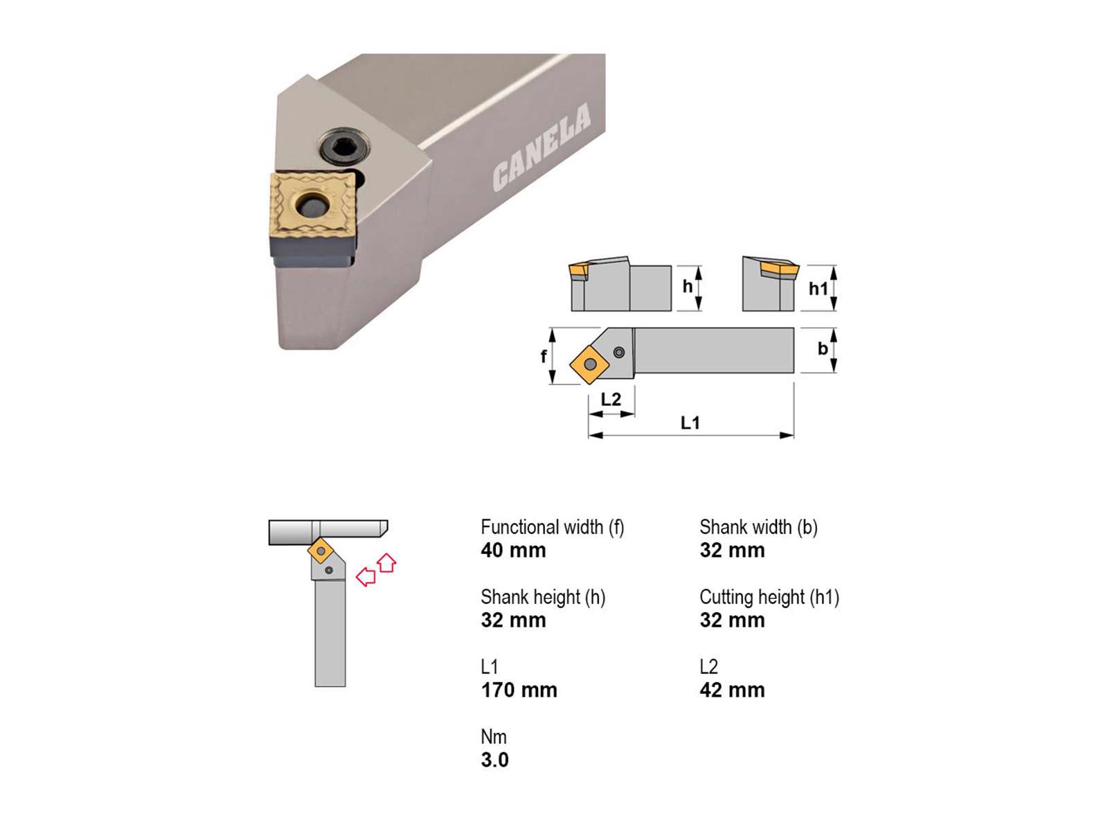 Canela stålholder PSSNR3232P15 er en pålidelig og robust holder designet til professionelt brug. Med en kompakt og præcis konstruktion sikrer den optimale præstation og holdbarhed i bearbejdningsprocesser. Den er ideel til højreindgreb og anvender SNM..1506.. platte.