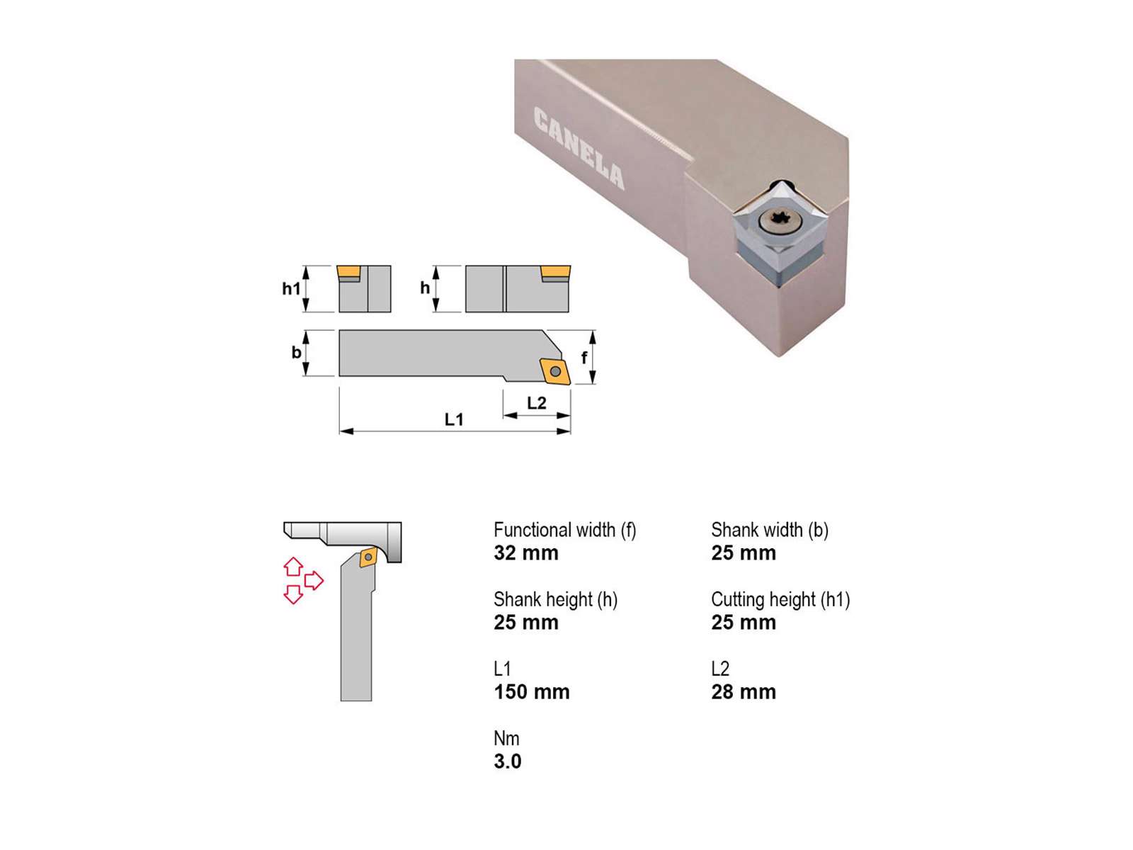 • Canela SCLCL1212F09 er en præcisionsholder til venstreskærende drejning med kompatibilitet til CC..09T3.. vendeskær. Den er velegnet til applikationer, hvor der kræves præcis styring og stabilitet under skærende bearbejdning uden indvendig køling.