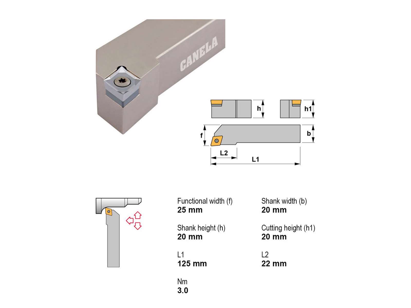 Canela SCLCR2020K9-A er en kompakt stålholder til højreindgreb med firkantet 20x20 mm skaft. Den er beregnet til CC..09T3.. vendeskær og leveres uden indbygget køling. Velegnet til præcisionsopgaver i automatiserede drejeoperationer.