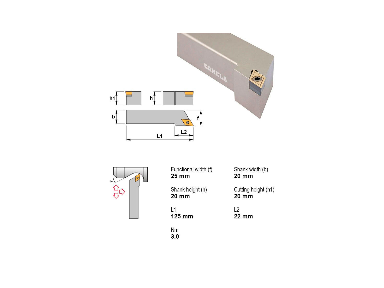 Canela SDJCL2020K11 er en kompakt og slidstærk stålholder med 20x20 mm skaft, der passer til DC..11T3.. plattetyper. Den er velegnet til præcisionsbearbejdning med venstre indgreb og uden intern køling.