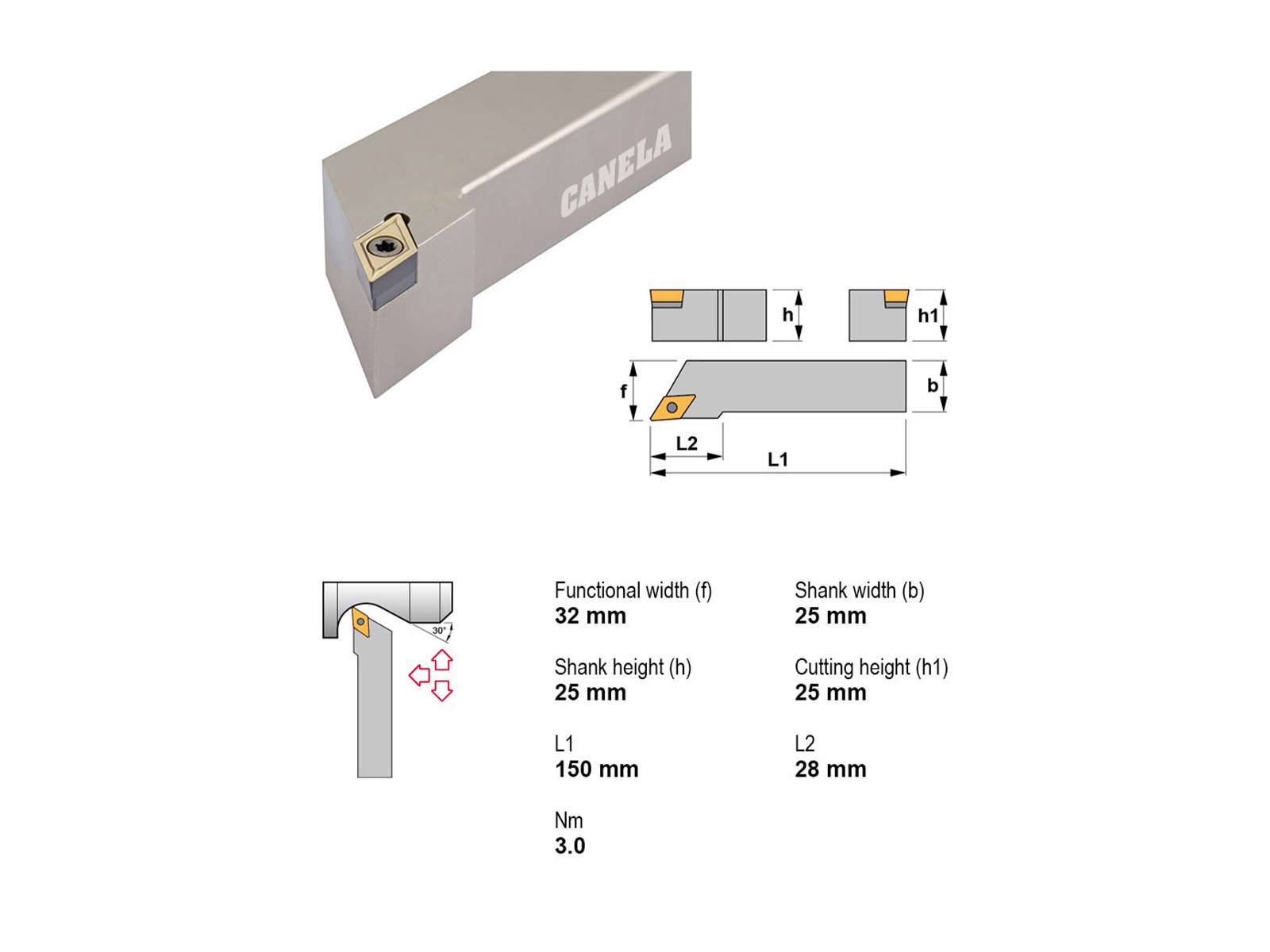 Canela SDJCR2525M11 er en højreindgreb stålholder til DC..11T3.. platteindsatser. Den firkantede skaftprofil på 25x25 mm og solide opbygning sikrer stabilitet ved drejning uden køling.