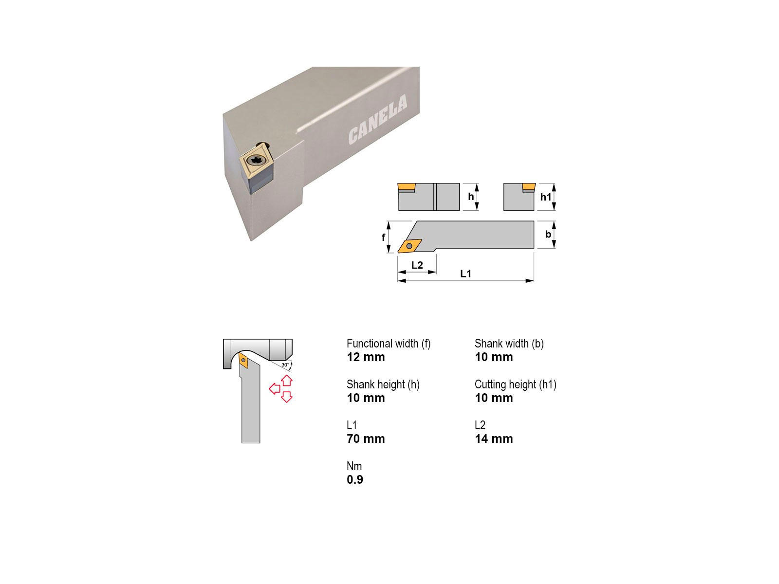 Canela SDJCR1010E07 er en robust stålholder til DC..0702.. vendeskær, designet til højreindgreb i drejeoperationer. Med sin kompakte størrelse og præcise tilpasning er den velegnet til mindre drejebænke og opgaver med begrænset plads.