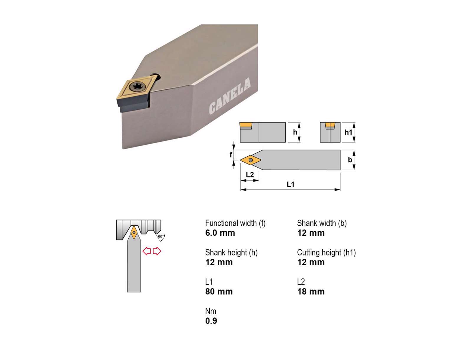 Canela SDNCN1212F07 er en kompakt stålholder til præcisionsdrejning med DC..0702.. plattetyper. Med et 12x12 mm skaft og neutral indgreb sikres stabilitet og alsidighed ved intern og ekstern bearbejdning.
