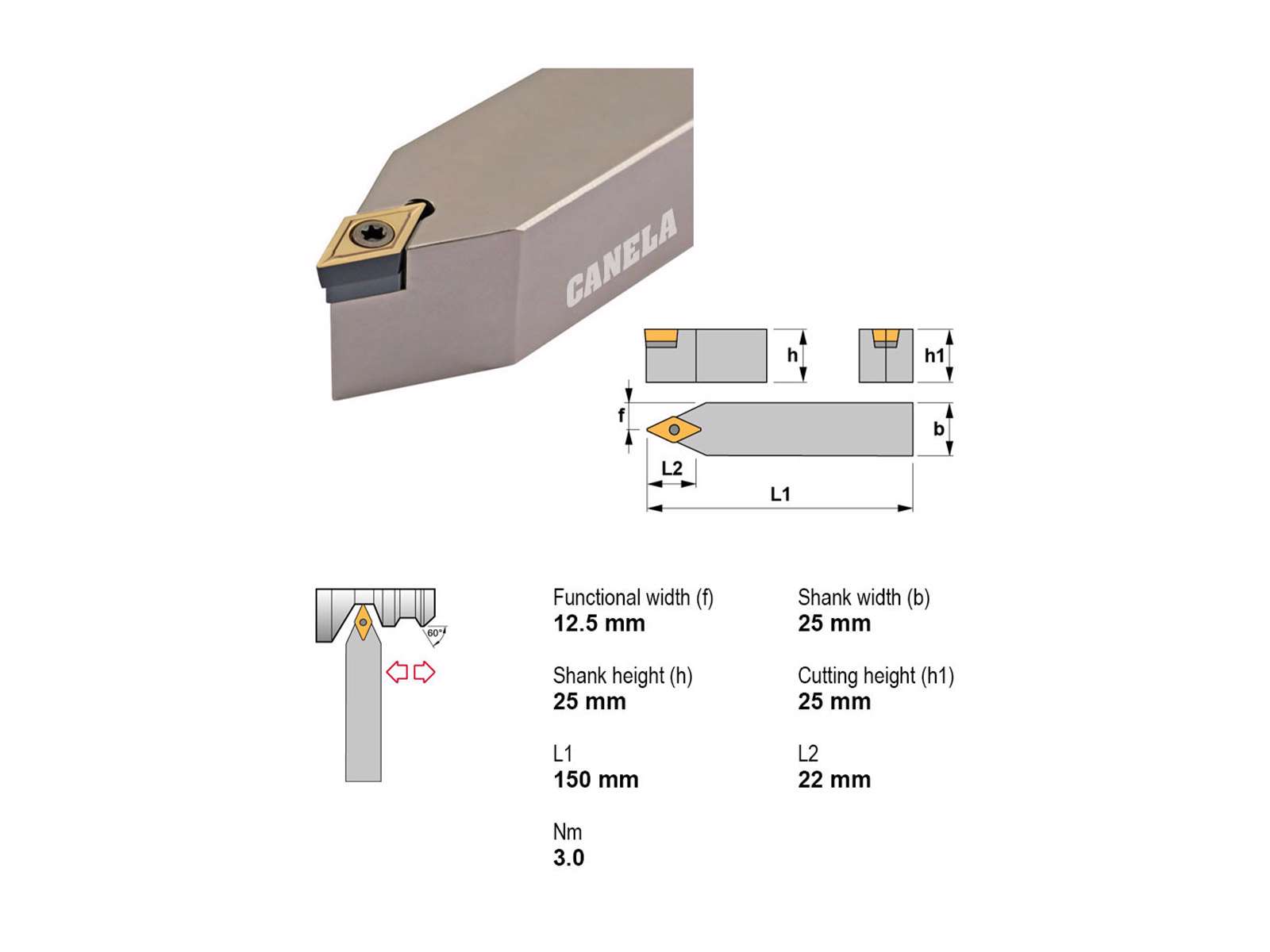 • Canela SDNCN2525M11 er en robust stålholder til indvendig og udvendig drejning med DC11T3-skær. Den kvadratiske 25 mm skaft sikrer stabilitet og præcision under bearbejdning, selv ved krævende opgaver. Designet uden køling og med neutralt indgreb, hvilket gør den velegnet til universel brug i manuelle og automatiserede processer.