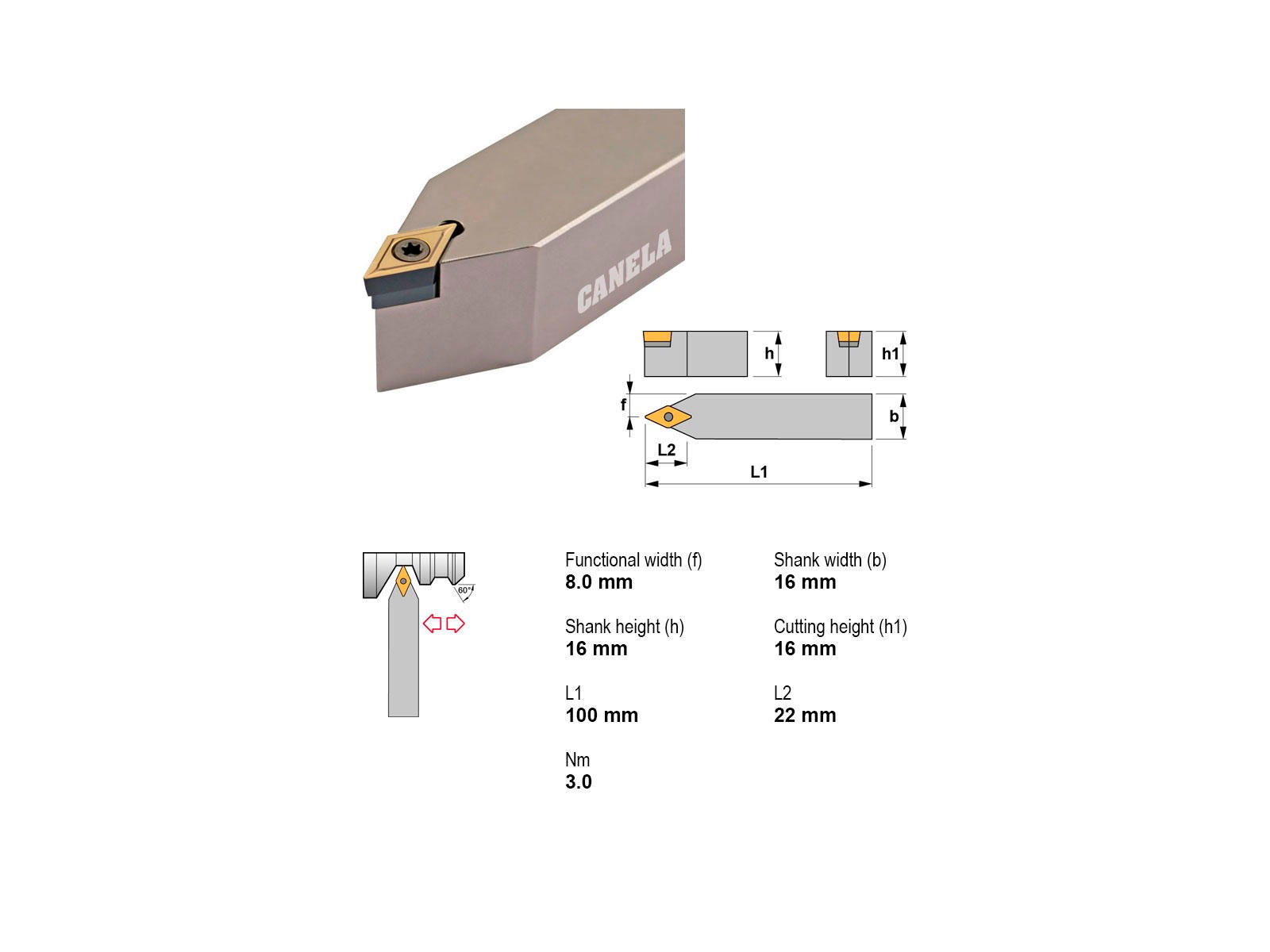 Canela SDNCN1616M11 er en præcisionsstålholder til DC..11T3.. vendeskær. Den er konstrueret med et 16x16 mm skaft og har en totallængde på 100 mm, hvilket gør den velegnet til standarddrejning uden køling. Neutral indgreb muliggør fleksibel bearbejdning i begge retninger.