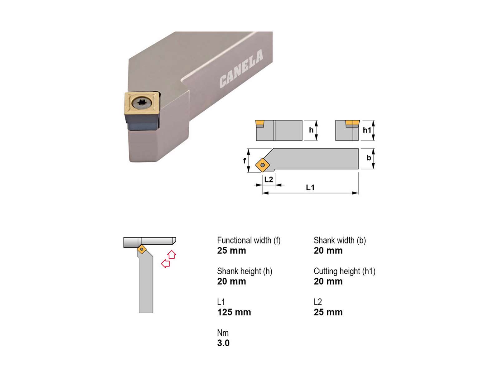 Canela SSSCR2020K12 er en præcisionsstålholder til drejeopgaver, kompatibel med SC..1204.. vendeskær. Den er udført i solidt stål med højre indgreb og uden køling, hvilket gør den velegnet til tørbearbejdning i industrielle miljøer.