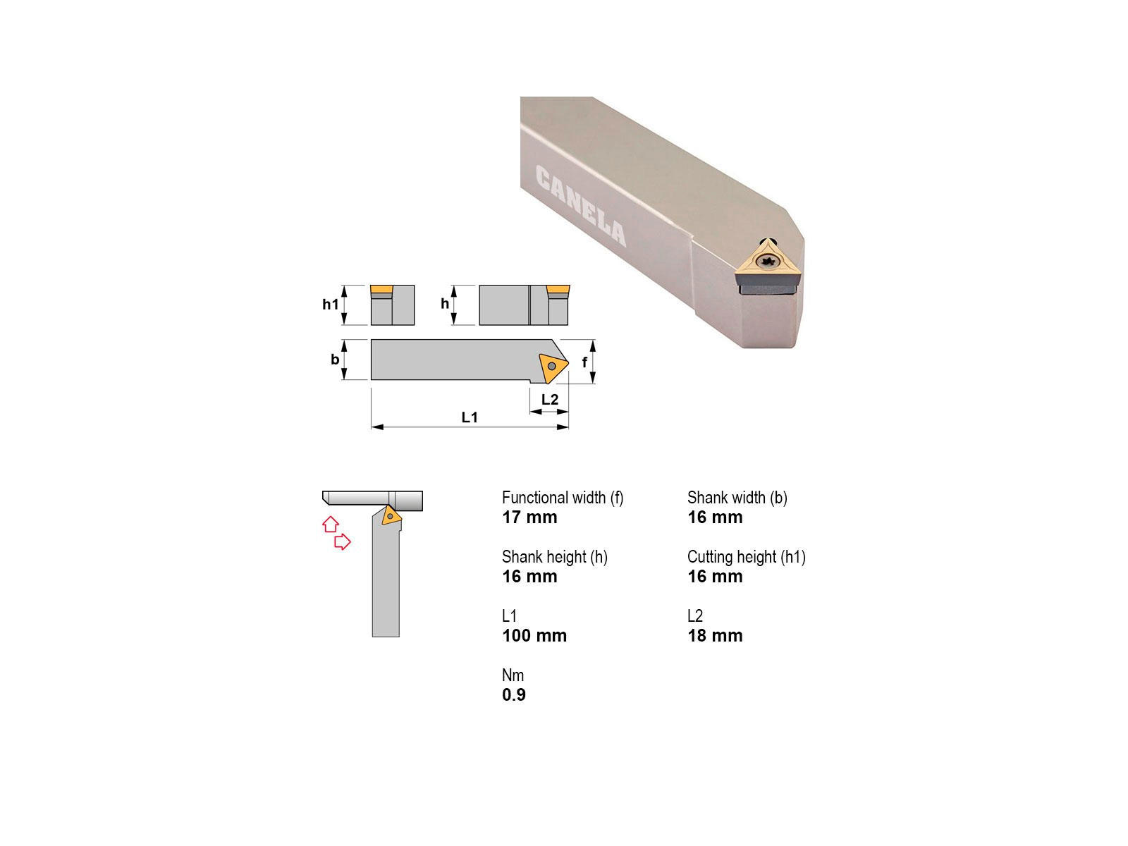 Canela STDCL1616H11 er en robust stålholder til venstreskærende applikationer, kompatibel med TC..1102.. vendeskær. Den er konstrueret i solidt stål og leveres uden indbygget køling, hvilket gør den velegnet til tørbearbejdning i standarddrejeopgaver.