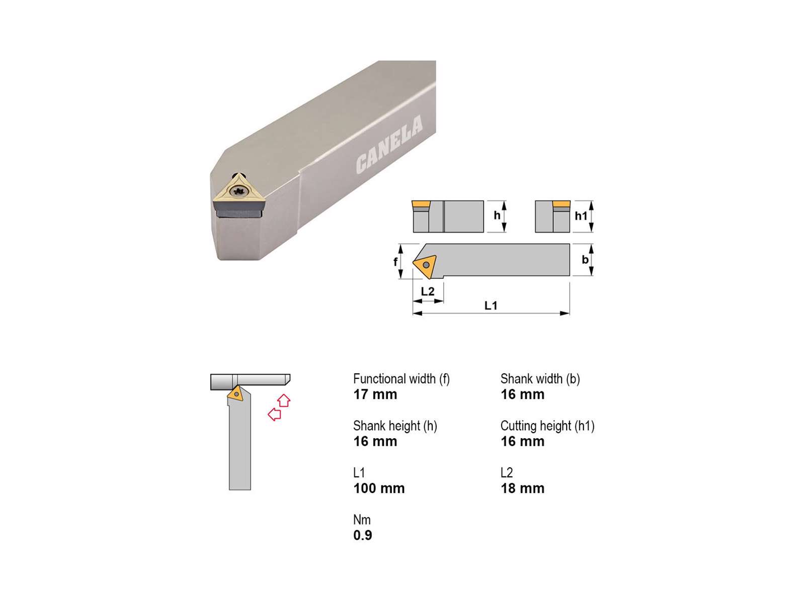 Canela STDCR1616H11 er en præcisionsstålholder med højre indgreb og fast skaftdimension på 16x16 mm. Velegnet til skær i TC..1102..-serien og ideel til tørbearbejdning uden køling.