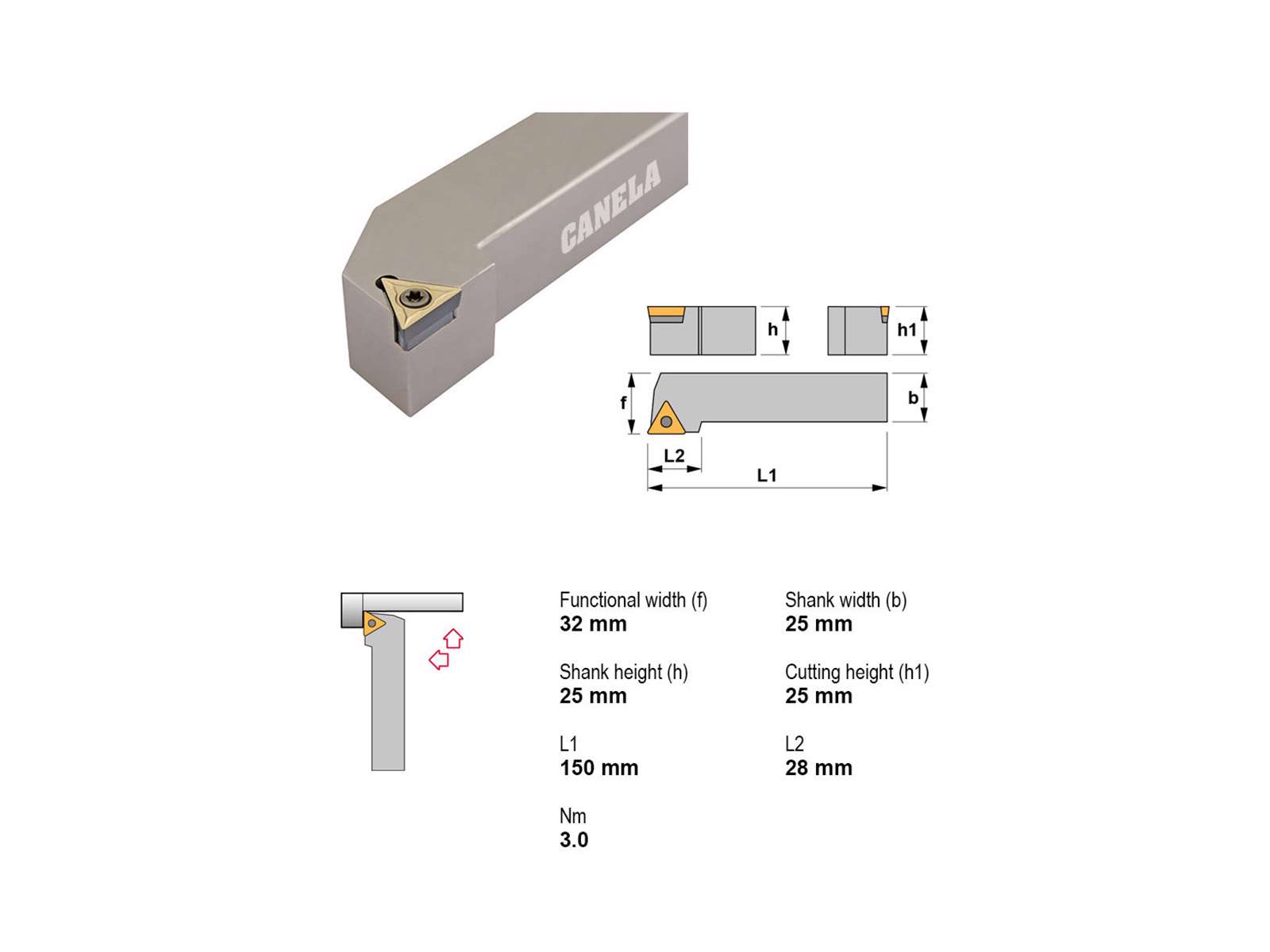 Canela STGCR2525M16 er en stabil stålholder til højreindgreb, kompatibel med TC..16T3.. vendeskær. Den kvadratiske skaftprofil på 25x25 mm sikrer præcis montering i værktøjsmaskiner uden intern køling.