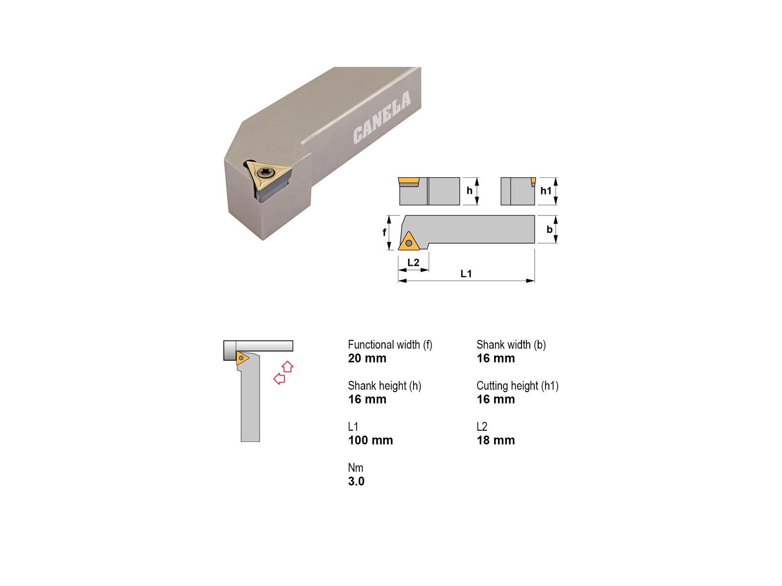 Canela STGCR1616H16 er en kompakt og stabil stålholder til drejning med højre indgreb. Den er kompatibel med TC..16T3.. vendeskær og sikrer pålidelig fastspænding og præcis bearbejdning uden brug af køling.