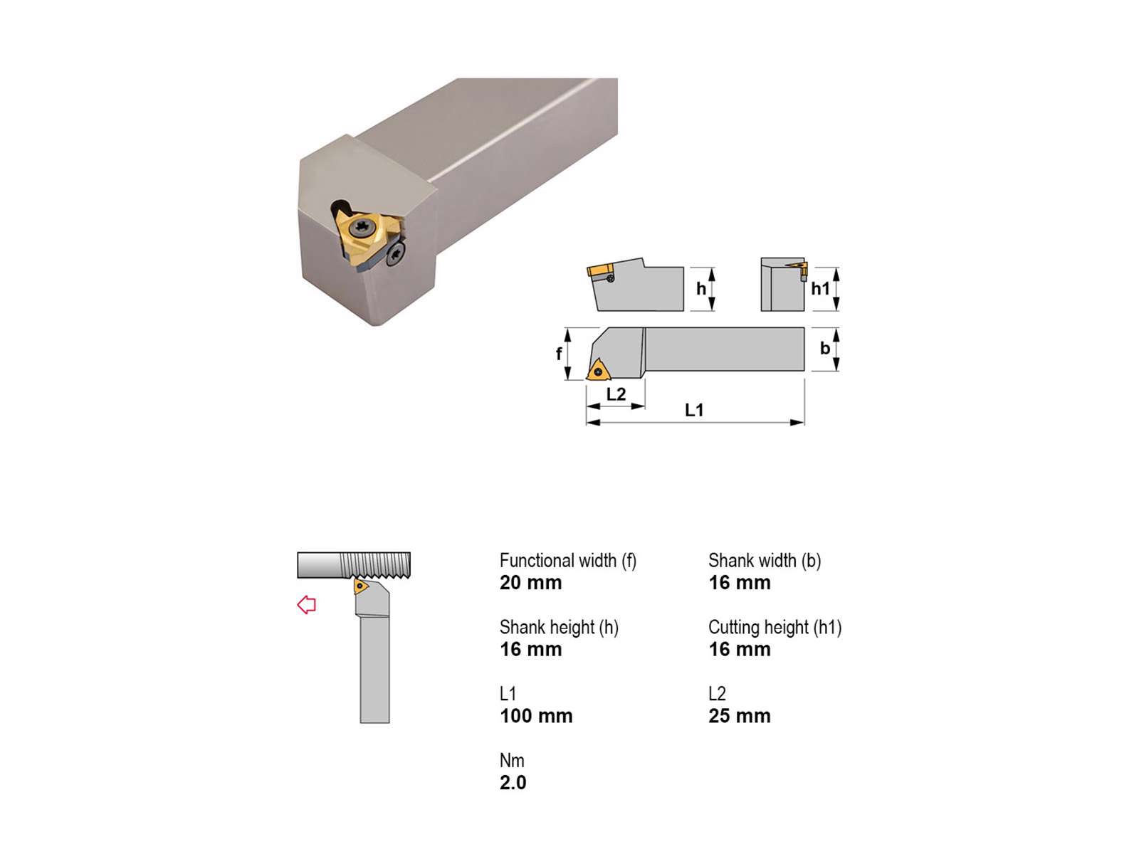 Canela STXNR1616F16 er en robust stålholder til højreindgreb, konstrueret til effektiv brug med plattetyper i 16ER-serien. Den faste konstruktion i stål og den præcise pasform sikrer stabilitet under gevinddrejning uden brug af køling.