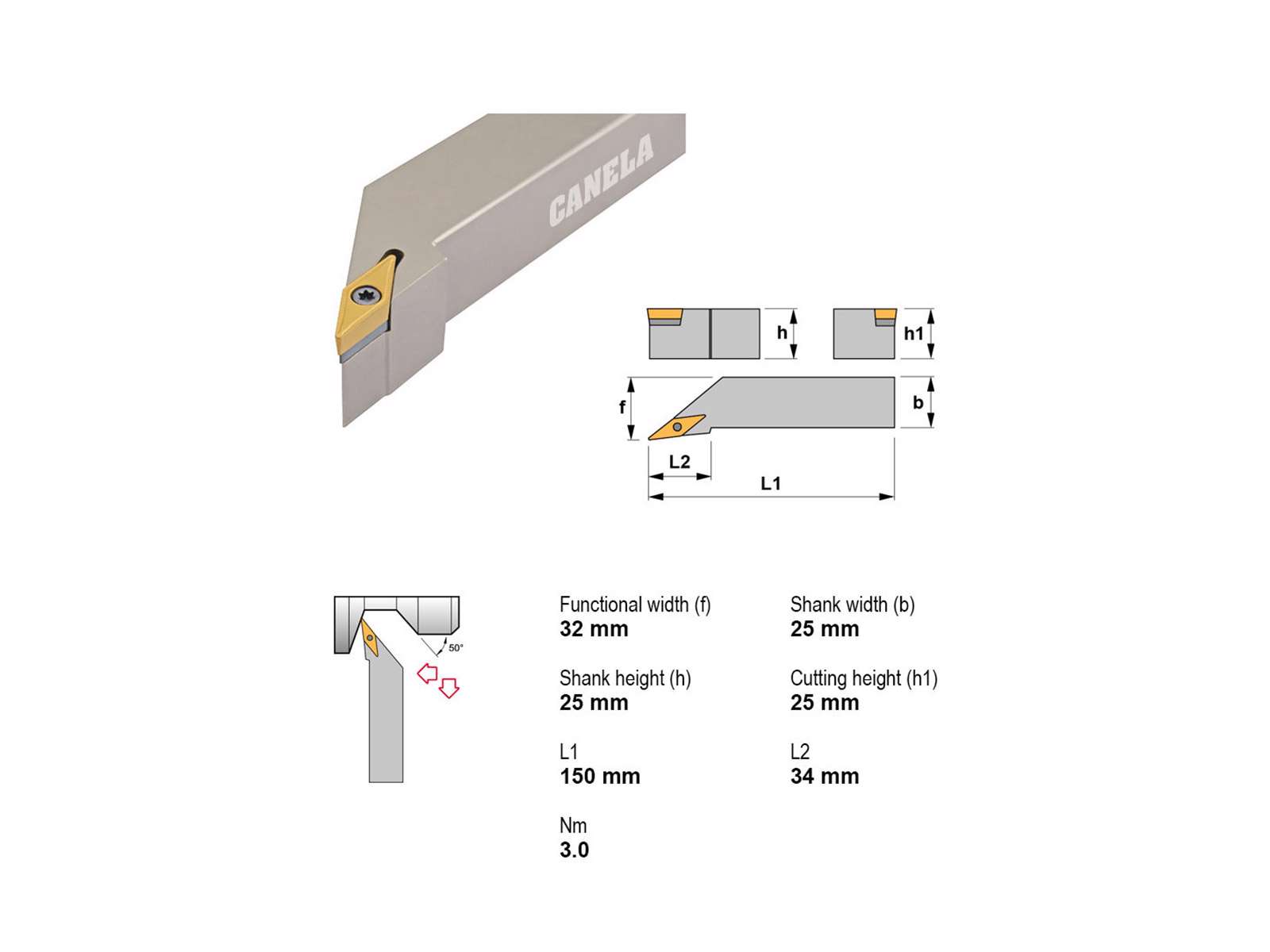 Canela SVJBR2525M16 er en robust stålholder uden køling, kompatibel med VBMT1604-skær. Den egner sig til højre-skærende operationer og er udformet med 25x25 mm skaft og 25 mm skærehøjde, hvilket sikrer stabilitet og præcision i drejeopgaver.