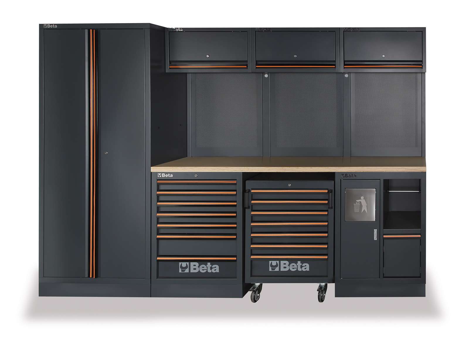 Værkstedsindretning C45PRO W, konstrueret for at skabe et optimeret og funktionelt arbejdsområde. Dette produkt er resultatet af teknologisk finesse, hvor moderne design og tekniske specifikationer forenes for at levere en attraktiv balance mellem kvalitet og omkostningseffektivitet.