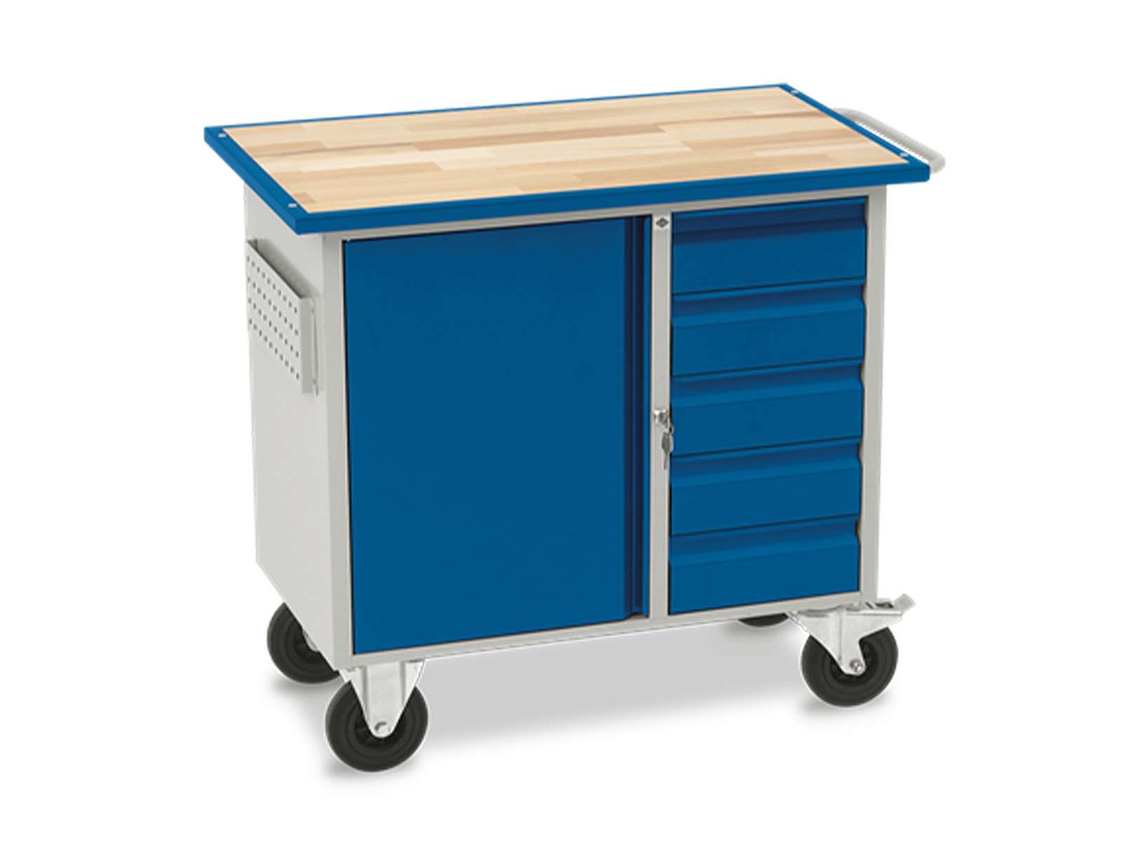 Denne værkstedsvogn, type VV-3, leveres med en stærk stålramme og en bøgeparket bordplade. Den er udstyret med 2 faste og 2 drejelige hjul med bremse, der giver let bevægelighed og stabil positionering. De 5 skuffer er udstyret med stålkugleudtræk og skuffespærre, hvilket sikrer enkeltvis udtrækning af skufferne. Desuden har vognen en skabssektion med en dobbeltpladedør og en flytbar, galvaniseret hylde til ekstra opbevaringsmuligheder.